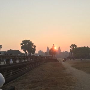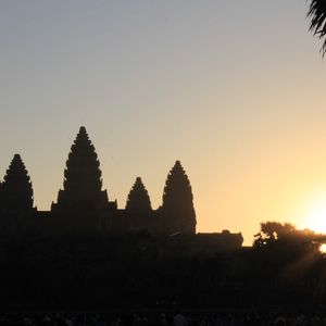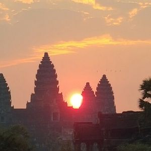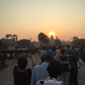 アンコールワットは春分と秋分の日に行けば朝日は中央の塔から太陽が出てくるように設計されています。しかし元旦に行くと、かなり向かって右側から出てくるので眺めとしてはいまひとつになります。さらに混雑は激しく、特に太陽が見やすい左側の塔が見える位置は早く着かないと厳しいです。ツアーの現地への到着時間はまずます早く、ギリギリ日の出を眺める位置をいろいろ検討することができました。初日の出をアンコールワットでみる貴重な体験ができて参加して良かったです。