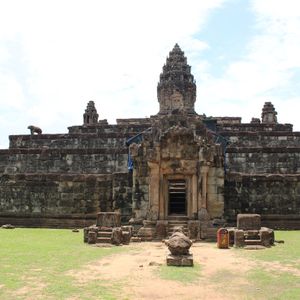 バコン寺院は、カンボジアにあるアンコール遺跡のひとつで、その中でもロリュオス遺跡群のひとつです。ロリュオスはアンコール地域に王都が置かれる前に、王都が置かれていた場所です。その時代に創建された3寺院をロリュオス遺跡群と呼び、バコン寺院は、ロリュオス遺跡群の中でも最も規模の大きな寺院です。バコン寺院は5層のピラミッド型に構成されていて、アンコールワットの原型となったと言われています。シェムリアップから南東に13kmほどのところにあります。