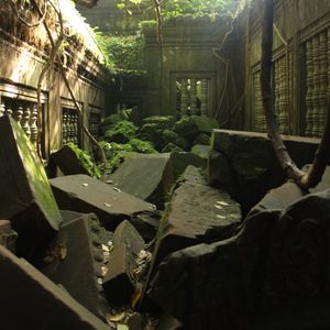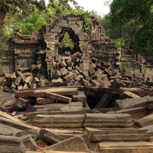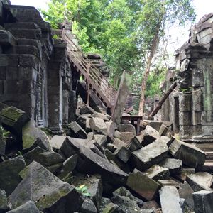 ロレイ、プリアコー、バコンの3寺院を巡った後は、車で45分ほどのベンメリアへ移動。ちなみに、ロリュオス遺跡群の3つはアンコール遺跡の共通チケットで入れますが、ベンメリアは別に購入(5ドル)が必要です。ベンメリアは発見当時のままの姿が残され、というよりも、直しようがないのではと思われるほどの崩れ方であり、ツタが絡み苔むした遺跡の回廊を歩くと、崩れた砂岩にうつる光と影のコントラストが非常に美しいです。
