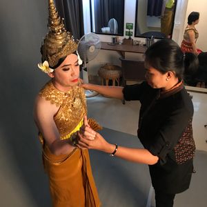 本格的な舞台メイクをしてくださいました。普段目の周りを舞台用にメイクすることはないので、新鮮でした。普段とは全然違う私になりましたが、貴重な経験になりました。友人知人にもみせて楽しんでいます。前日夜にアプサラ舞踊をみていたので、衣装もこのようにして着るんだなとか。王冠はこんなに重いけど、このままあんな素敵なダンスをするんだな・・・とか知ることができる機会になりました。時間の余裕は見ておいたほうがいいですね。メイク落としはありますが、もしも心配でしたら、自分の慣れた本格的なアイライナー等も落とせるメイク落としを持参してくださいね。途中自分のスマホでも撮ってくれますが1週間以内、後日送られてくる写真の方がいいですよ♫画質もかなりいいのをおくってくださいます。