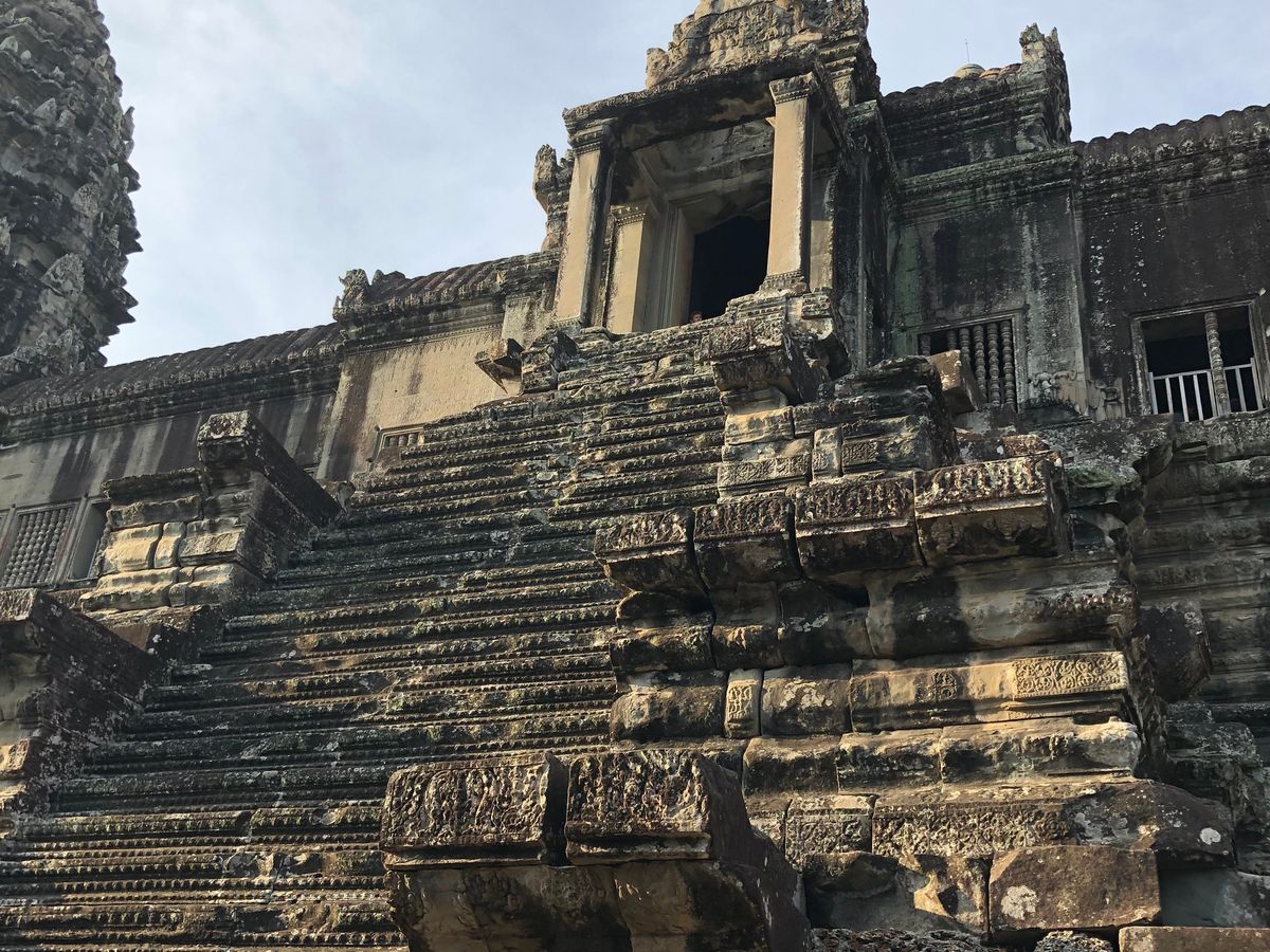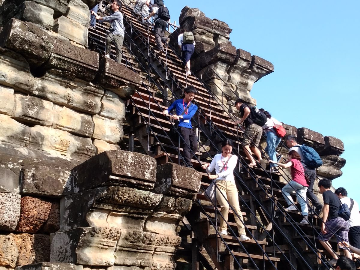 アンコールワットは迫力あります。でもとにかく階段が多い。メインの第三回廊への階段も、かなり急で上るのはちょっと怖いですね。今回行った5月中旬は閑散期ということで、まったく待たずに上れたのはよかったです。