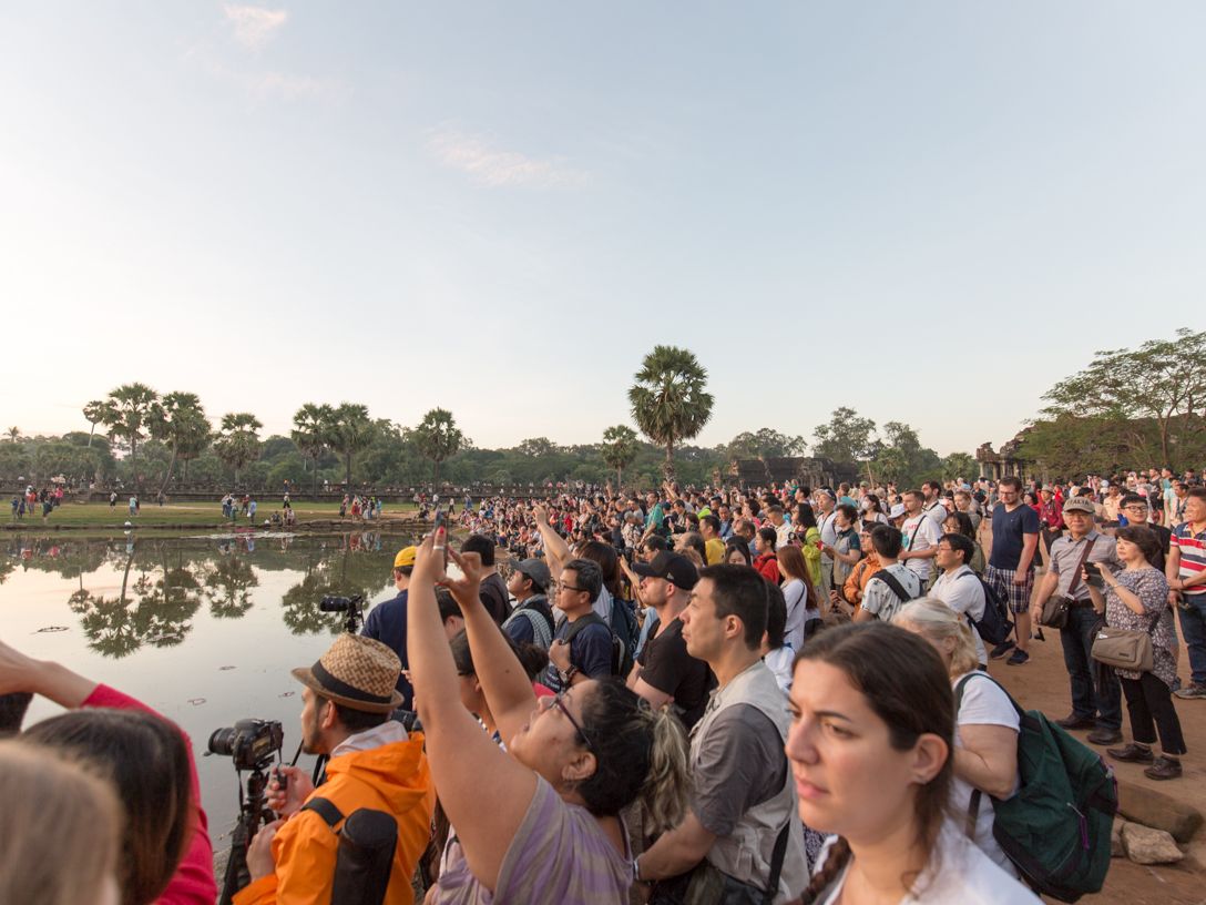 早朝ですが、ツアーで参加した時点で既に現地には大量の観光客が待機しています(彼らは個人でトゥクトゥクなどを手配した欧米人が大半です)。そのため、三脚を持ってしっかりとした写真を撮るのは非常に困難です。自分の場合は、一眼レフに1脚をつけて、人の頭の上から持ち上げる形での撮影です。ISOに妥協すればぶれない写真を撮ることは可能です。