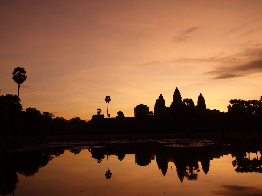 アンコールワットでの朝日鑑賞は朝早いのですが、水面に朝日と遺跡の影が映り幻想的な景色となります。