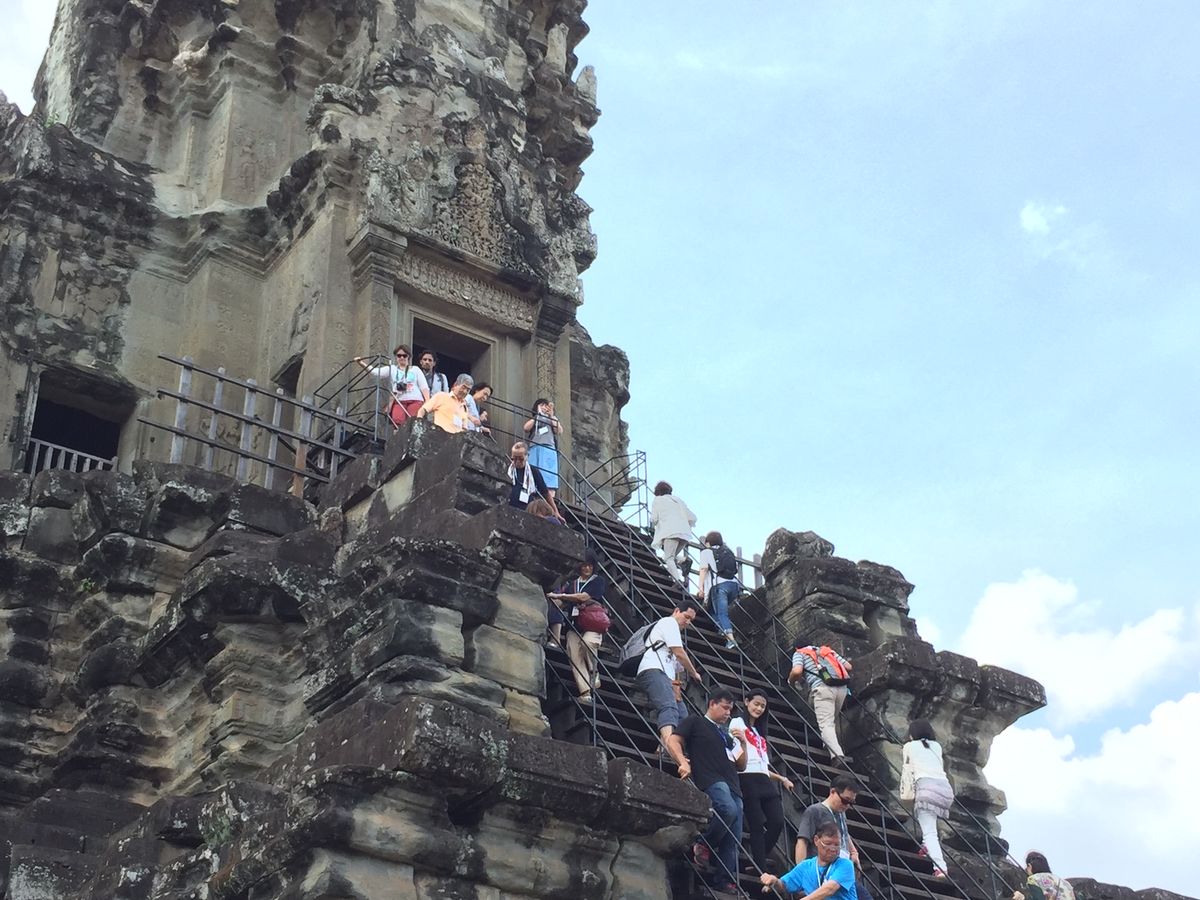 午後からはアンコールワットに入場し、第一・第二回廊とガイドさんの説明を受け、ツアーの参加者のみ第三回廊に上りました。かなり急な梯子みたいな階段を昇降しなくてはならずキツかったです(^_^;)