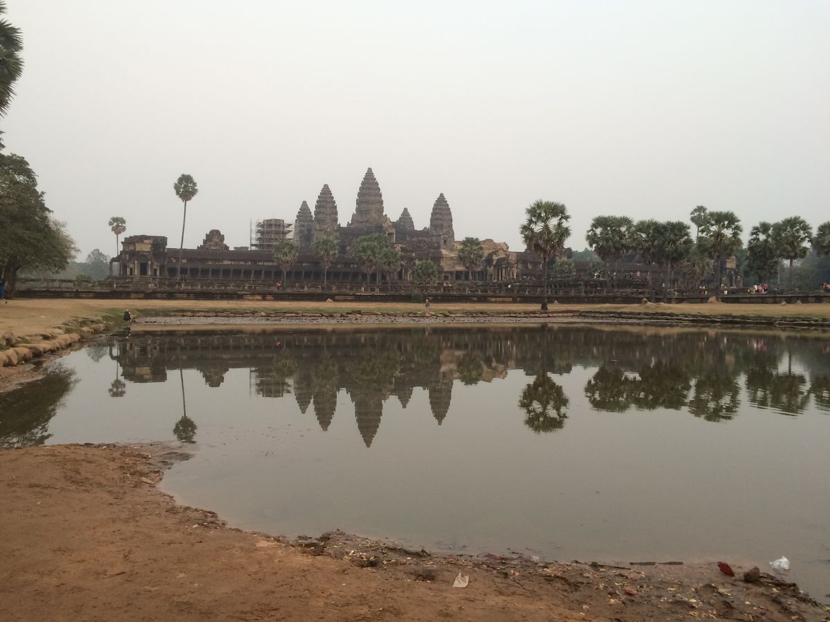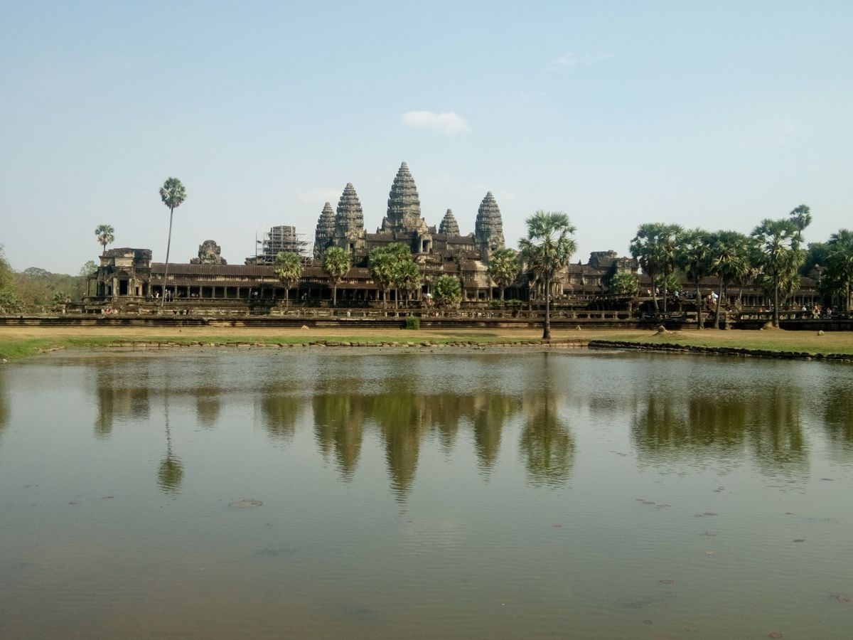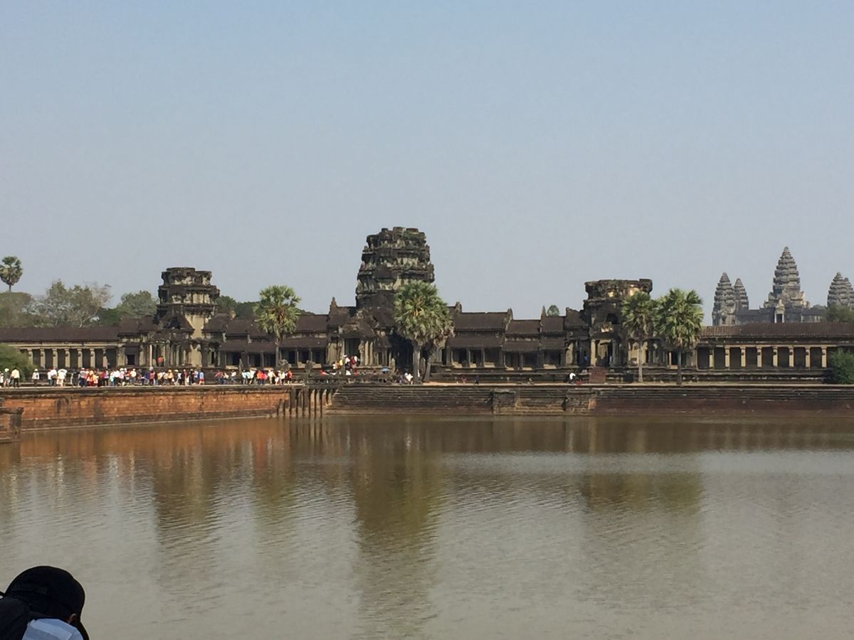 初めて見るアンコールワットはとにかく壮大!そのスケールに圧倒されつつ、写真のような逆さアンコールワットの撮影スポットも教えていただき、また第一回廊のラーマーヤナの壁画についても色々話を聞けて、とても満足な一日でした。惜しむらくは夕方にかけて曇ってきて、雲の切れ間から顔をのぞかせる程度でしたが、とても良かったです。