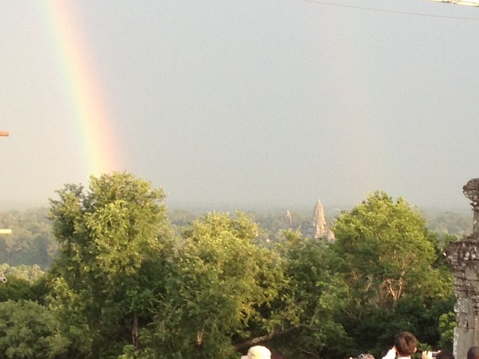 最後にプノンバケンに登ってサンセットを見るんですが、ラッキーなことがありました。アンコールワットの近くに大きな虹が!雨季だったので、夕方から雨の気配がして不安だったんですが、ならではのいいこともあるんですね〜。