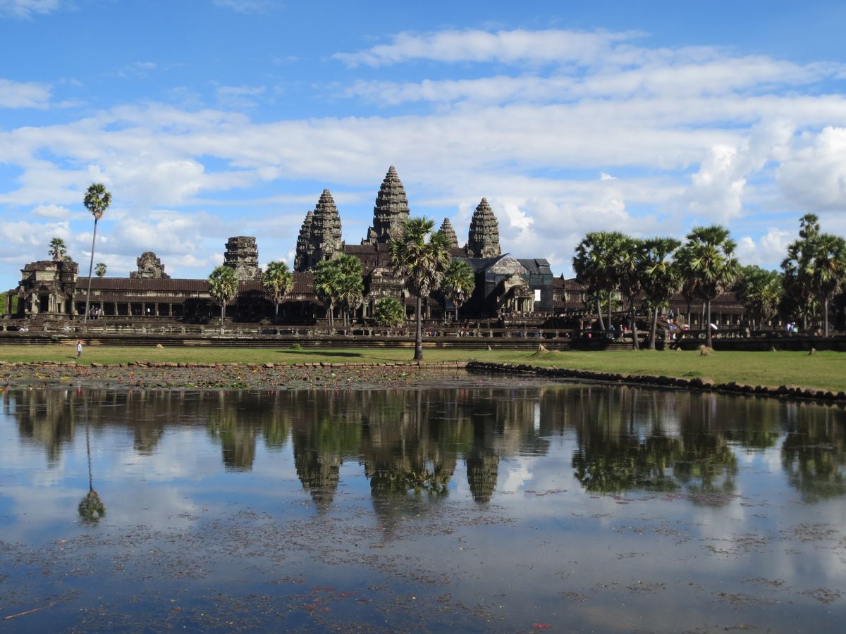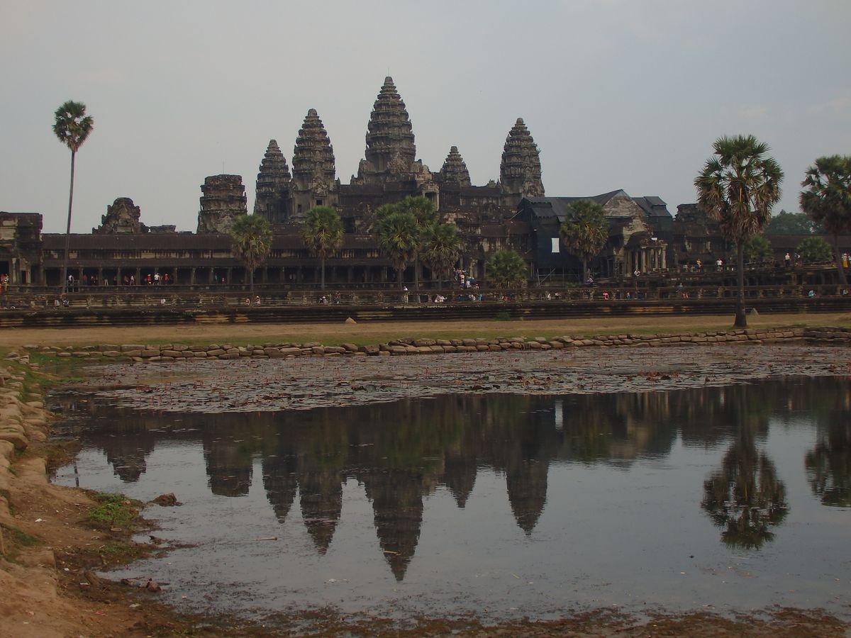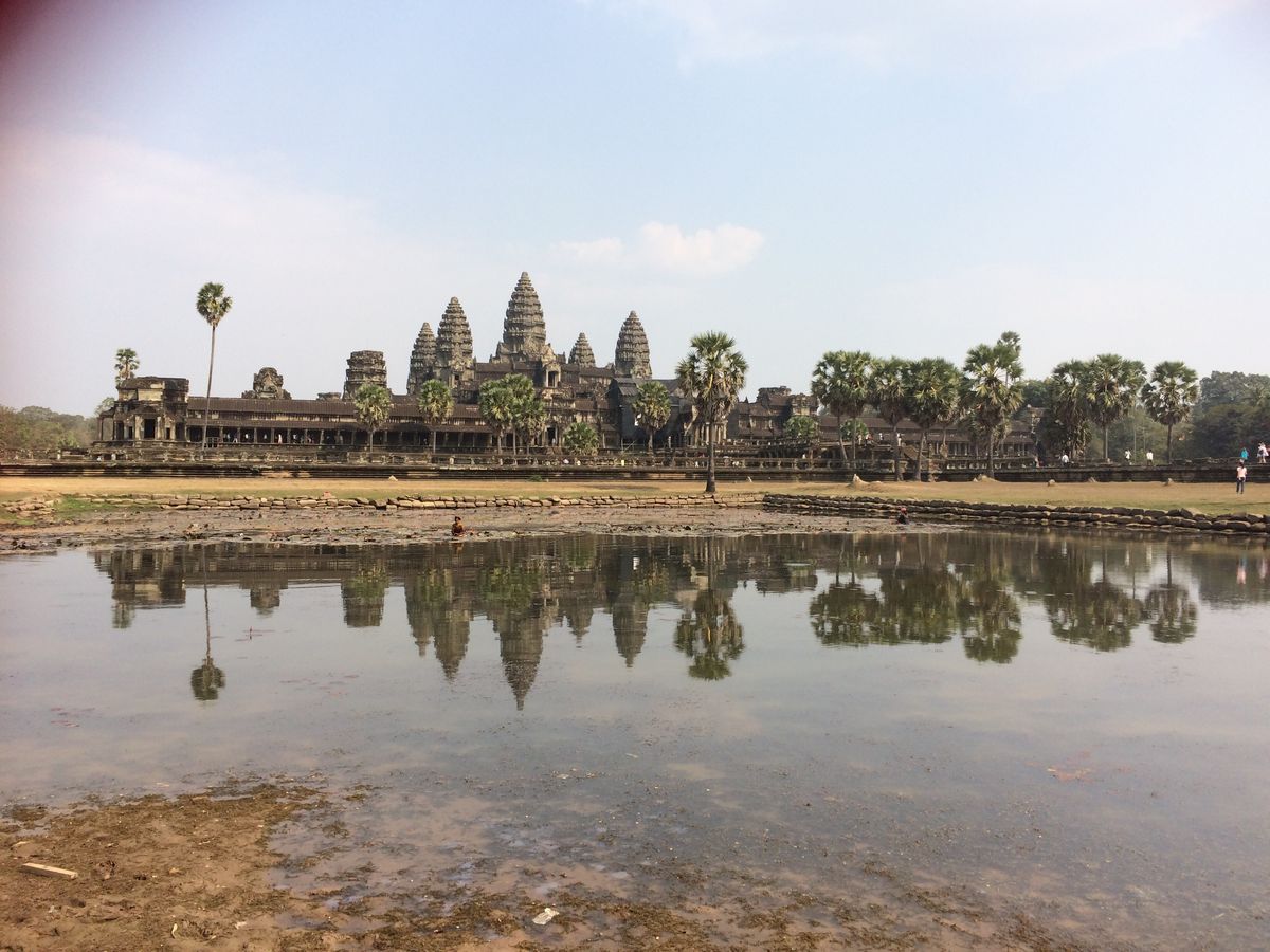 朝晩はモヤがかかり、朝日夕日を拝むことはできませんでしたが、日中は晴天で、池に映る逆さアンコールワットは非常に綺麗に映すことができました。