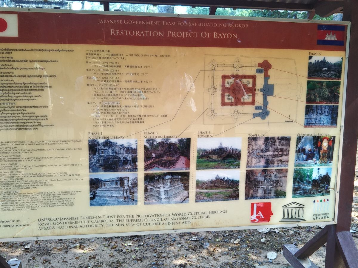 アンコールトムの遺跡は壮観。どうやって作ったのかという点については、説明してもらい、ようやく納得したが、それをあの高さまで、また、何十年にもわたって、また、何人もの王がそれぞれ別に造らせたということを考えると、ものすごい権力をもち、また労力をつぎ込ませたことが想像できる。バイヨンはその点では圧巻。フォトスポットを教えてもらえたのは良かったが、一周10分はちょっと短い気もする。また、像のテラスとライ王のテラスはさらっとながして移動してしまったが、もうちょっとゆっくり見たかった。ピミアナカスは記憶にない…。暑さでもうろうとしてたか。