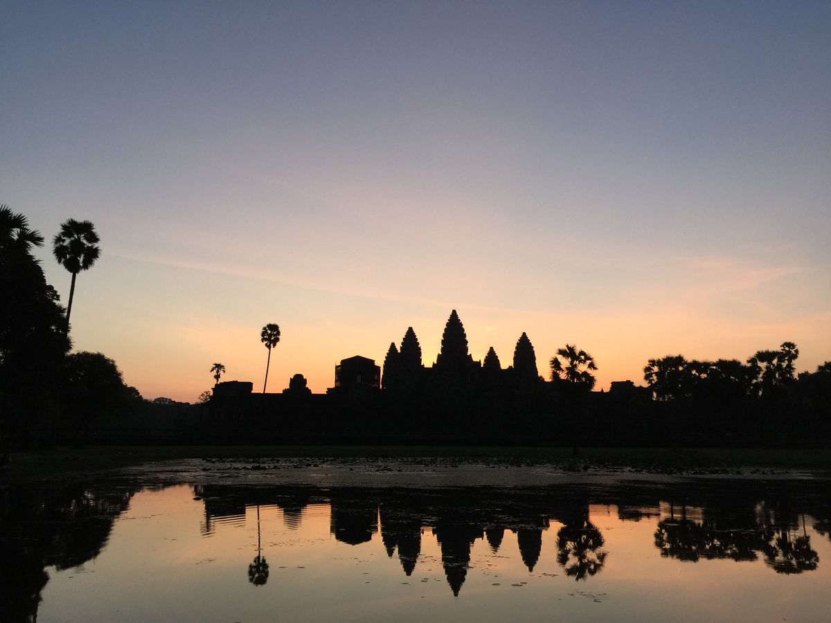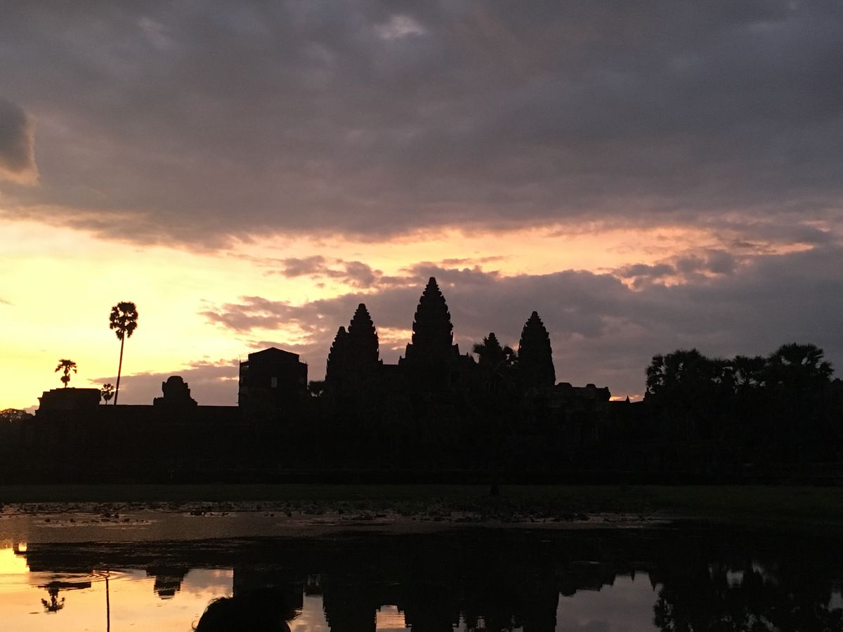 アンコールワット朝日鑑賞ツアーは、真っ暗なうちから現地に向かいます。時間が経つに連れアンコールワットが徐々に現れ、うす暗い中水面に映るその姿が幻想的で感動します!私達が行った時、雲が厚く太陽こそお目にかかれませんでしたが、それでも異空間体験は素晴らしかったです!