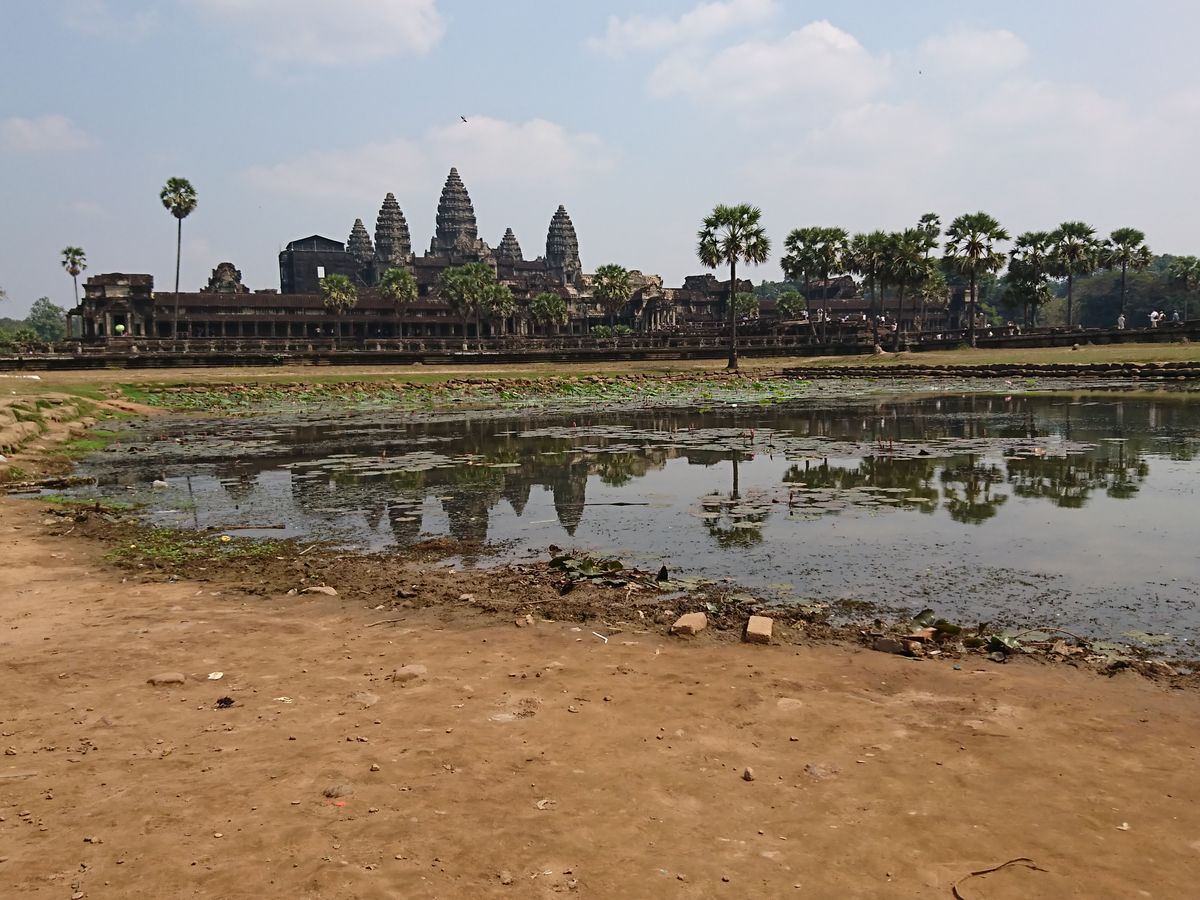 早朝のアンコールワットでは、既に撮影ポイントの池の回りは人で溢れてましたが、ガイドさんが一番前で写真を撮ってくれてすてきな1枚が出来ました。