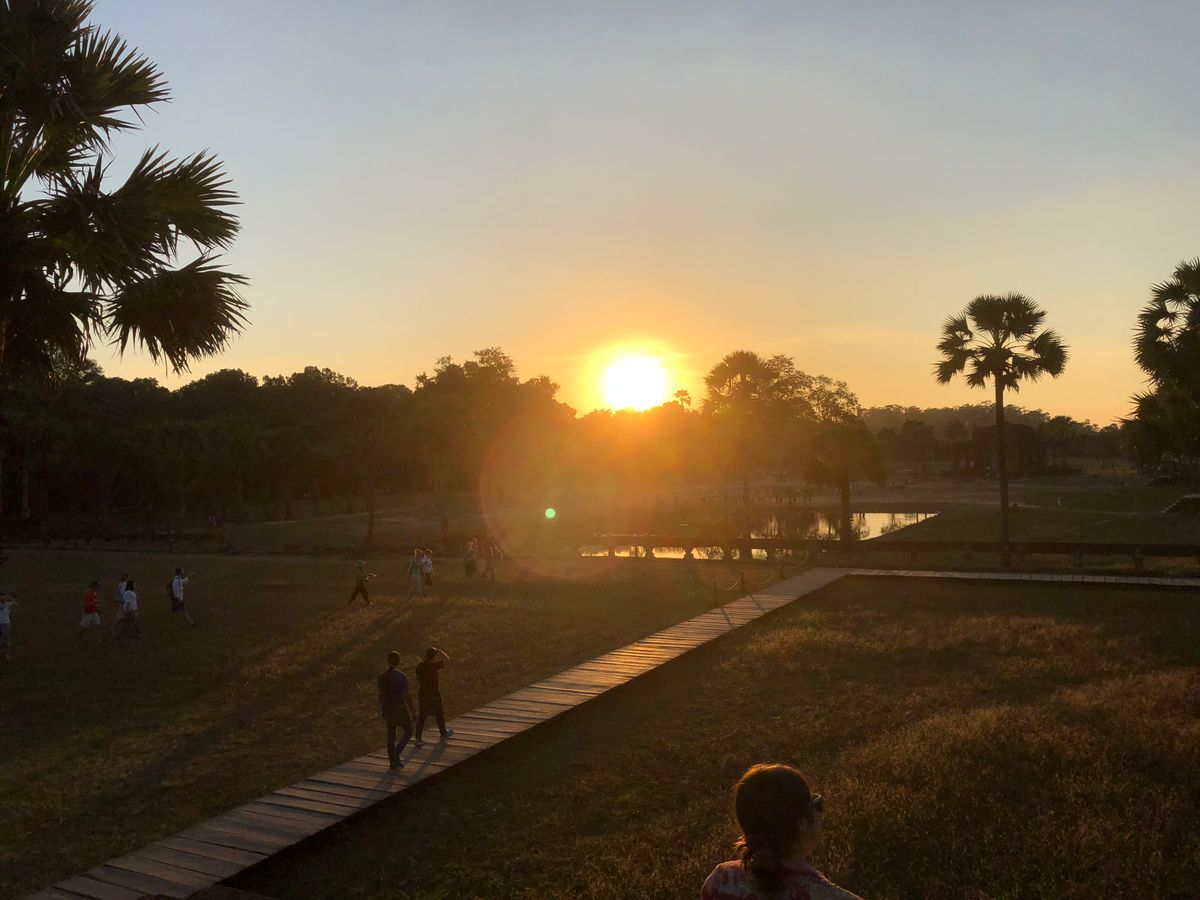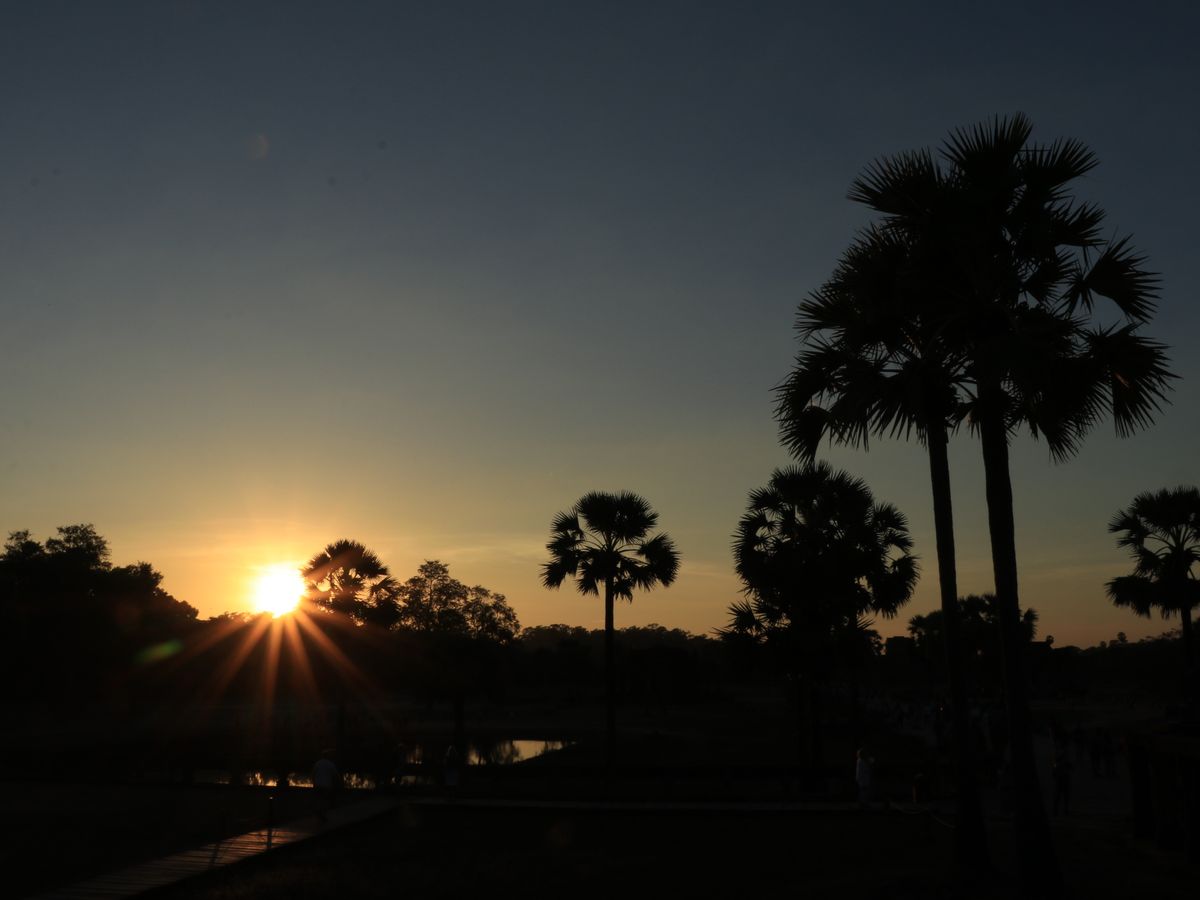 季節によって太陽が昇る位置が変わりますが、アンコールワットと日の出がきれいに写真に収まる位置をガイドさんが教えてくれました。