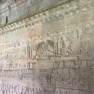 案内の通り、人気の遺跡を1日で回るツアーです。広い遺跡群のハイライトを見ることができるので、短期間の滞在でも十分にカンボジア、アンコールワットを見た気分になれます。滞在期間の短い方、そこまでじっくり遺跡を見なくても、要所を見れれば良いという方にはオススメです。ゴールデンウィークの滞在で、気温は35〜37℃程度。そこまで歩きが多いわけではありませんが、天気が良く、汗だくになるので体力はなかなか奪われました。ガイドさんは日本語勉強熱心な方で、壁の彫刻の意味まできちんと説明してくれました。