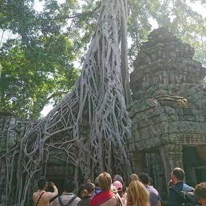 朝4時半にホテルへお迎え、色々なホテルにお迎えに回り、その後、遺跡入場チケットを買いに行きます。混載プランなので参加者は10人でした。マイクロバスで移動です。朝は少し肌寒いくらいで長袖の上着があった方が良いです。アンコールワットで朝日を見た後、ホテルに送っていただき、1時間程度後に、再度ホテルに迎えに来てもらい、アンコールトム→タプロム→アンコールワットの順に観光して回ります。途中、食堂で昼食をとります。普通に美味しく頂きました。夕方は夕日が沈む風景を見に行きますが、遺跡に沈んで行くわけではなく、ジャングルの中に沈んでいく感じです。日没前まで約1時間程度、その場所で待機して待ちます。高台でなくても夕日は見えますので、少し待ち時間が長いです。みんな地面に座り込んだりしていますので、敷物を用意しておくと良いと思います。最後に夕食とディナーショーでした。夕食は、バイキングなので、すべて冷えた料理で美味しくないです。唯一、美味しかったのは、すき焼き風のスープとガイドさんは言っていましたが、野菜、肉、麺か春雨など好きなものを、大き目のスープ皿に入れて料理人に渡します。出来てきたものは、塩ラーメンのようなあっさりタイプの麺料理で日本人の好みの味です。ディナーショーは、カンボジアの民族舞踊のようなもので、若い人たちは、面白くないようで、スマホで時間つぶししている感じでした。私も同様でした。1組のカップルは食事をしたらすぐに離団し、パプストリートにトゥクトゥクで行かれました。ツアーの利用の仕方としては、料理もまずく、踊りに興味のない方は、レストランに到着後、ガイドさんに離団を申し入れ、トゥクトゥクでパブストリートに行って食事した方が美味しく楽しいですよ。レストランの大ビンビールは4ドルです。パブストリートの生ビールは1杯0.5ドルなので、食事して飲んでも1人5~6ドルなのでそちらの方が楽しめると思います。