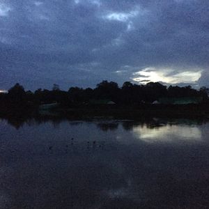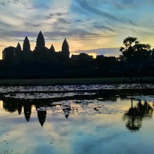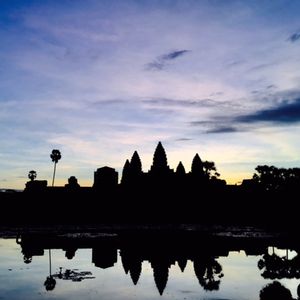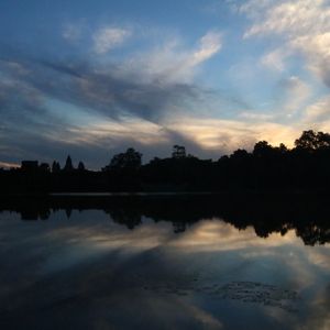 空の青さとアンコールワットのシルエット、水に映る逆さアンコールワット
