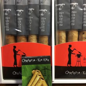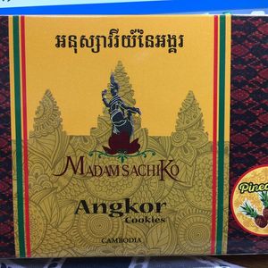 お土産屋(お菓子)さんに二箇所連れて行っていただきました。観光地のツアーにありがちな、ガイドやツアー会社とお店が結託してお金を使わせるものだと、思っていましたが、カンボジアならではの深い意味があって、自分を恥じました。内戦で人口の4分の1以上が殺された中で、カンボジアを復興し、若い人々に仕事の場を確保しようと奮闘している、日本人のお店2軒でした。1軒目は Tea Timeというお店で、店先で焼いて試食させてくださるノムトムムーンというカンボジアの伝統菓子をリファインしたものです。ヨックモックの大型版みたいなものですが、味はもっと素朴な感じがします。とてもおいしいですよ(写真)。2軒目は マダムサチコの アンコールクッキー(写真)のお店です。 両方とも、日本人が、カンボジア復興のため雇用創出に頑張ってできたお店と、帰国後に JAL会員誌AGORAのバックナンバーで読みました。事前にわかっていたらもっと買ってきたのに、と思っています。ネットでは、アンコールクッキーのお店についていろいろ悪くも書かれていますが、私は、お菓子を作っている人、ガイドさん、運転手さんにお金が回って、産業として成立するなら喜んで購入します。