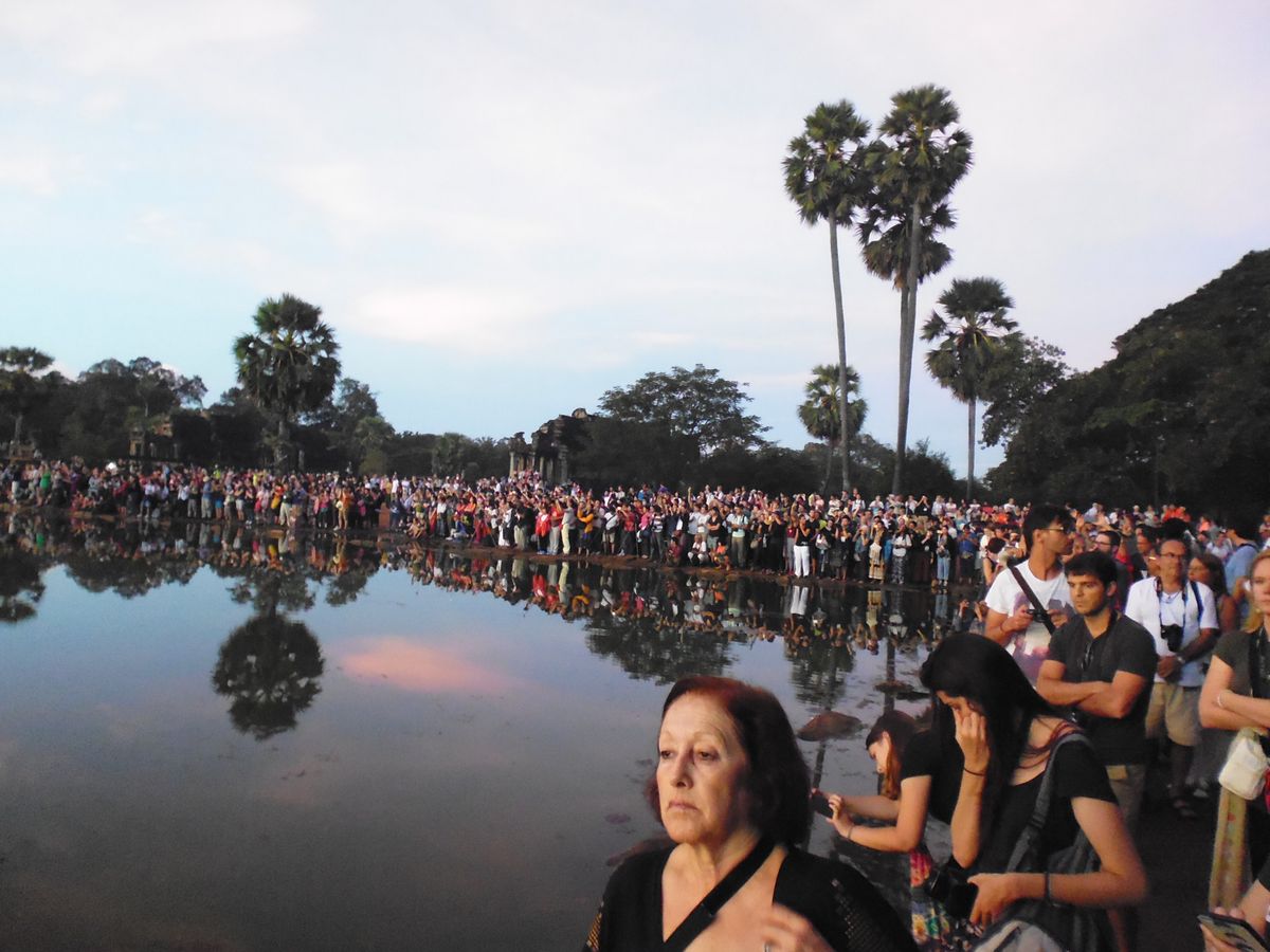 午前中はアンコールトム、トゥームレーダの撮影がおこなわれたタプロム他、ガイドさんの説明と写真撮影スポット紹介がありで午前の遺跡めぐりは終了。ランチはクメール料理のお店でした。ホテルに1時頃もどり2時間ほど休憩。3時10分午後のスタート。いよいよアンコールワットです。日曜日だからかなぁすごい観光客です。ガイドさんの案内で集団で行動している観光客の波にのまれることなく第2回廊まで観光することができました。が、第3回廊は大衆に飲み込まれ40分ほど並ぶこととなりました。多くのお国の方がそれぞれのルールで並びますので大混乱です。何とか夕日鑑賞にまにあう時間で第3回廊を見学することができました。