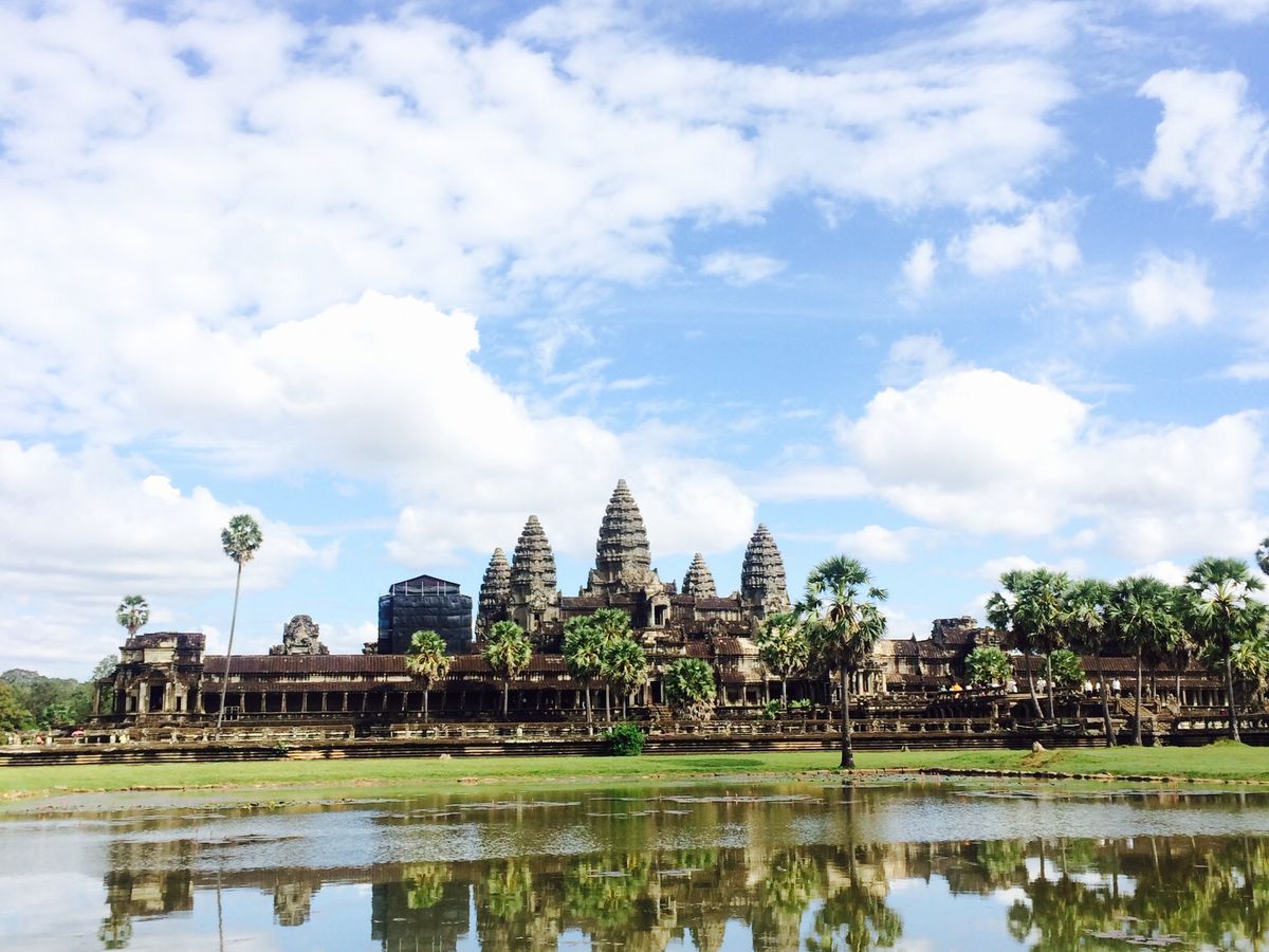 水面に映る逆さアンコールワットと空の青さ、素晴らしいの一言です。