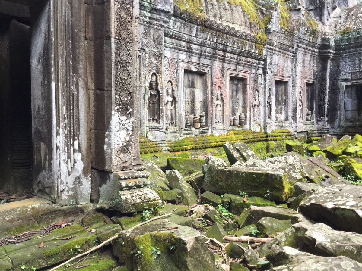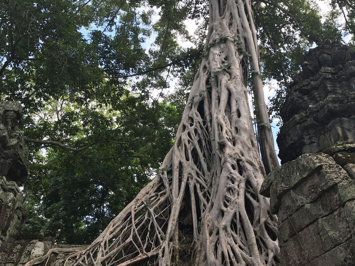 遺跡はというと、アンコールワットとは趣が異なり、神秘的な雰囲気に圧倒されました。苔の美しさや、崩れた建物、様々な場所から生え伸びる木の根など、写真を撮りたくなる風景ばかりでした。