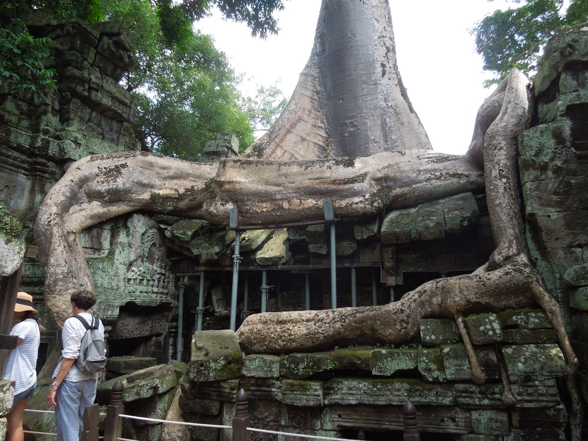 車窓からライ王のテラス・象のテラスを見学した後は、アンジェリーナジョリー主演の映画「トゥームレイダー」で一躍有名となったタプロームへ。巨大なガジュマルが絡みつく光景に遺跡自他が辿った数奇な歴史の深さを感じます。