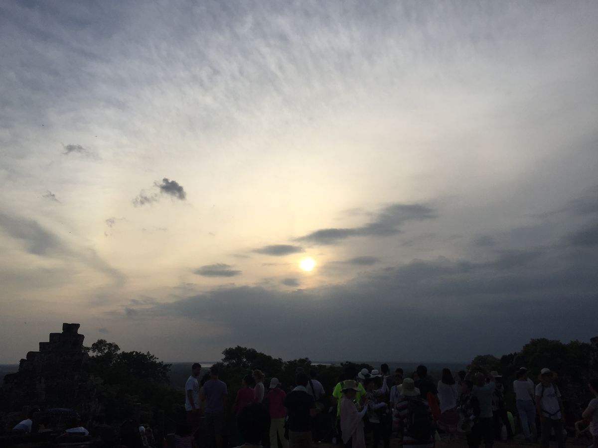 少し休憩した後にプノンバケンへ。300人限定とのことで4時前に山頂へ向かいました。トイレも売店も無いので、登る前にトイレを済ませ飲み物を確保することをおすすめします。山頂は日陰が少ないため、人がひしめき合っている中で待つしかありません。この日の日の入りは2時間半後…西日がきつい中ひたすら待ちます。疲労困憊の中これが一番つらかったのですが、一緒にツアーを回った人たちと東南アジア情報を交換できたのは楽しかったです。残念ながら夕日は雲がかかってしまい見れず(涙)。これもまた思い出となりました。
