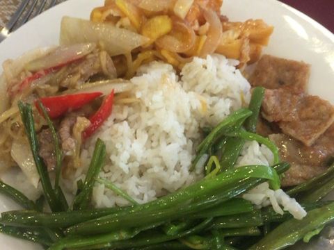 大皿の中華料理が5点+ライス+コーヒー。お味はまあ普通。取り分けは少し気を使いますね。