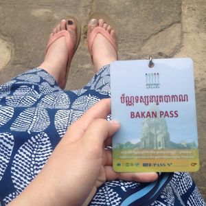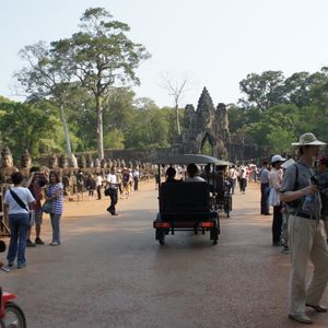 朝日を見るコースはかなり早朝起きだったのでそれはやめて夕日およびディナーショー付のコースとしました。ガイドさんがホテルに時間通りに迎えに来てくれてそこからまずはアンコール遺跡の入場券を買い、午前中はアンコールトム、午後はアンコールワットというスケジュールでした。ガイドさんは水のペットボトルを何本も用意してくれていて助かりました。また遺跡の中での写真撮影ポイントを教えてくれ、うまく写真を撮ってくれたりとお世話になりました。