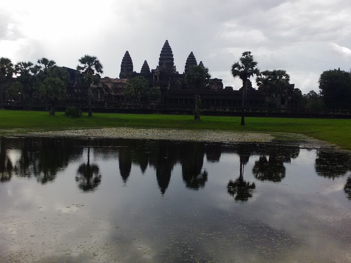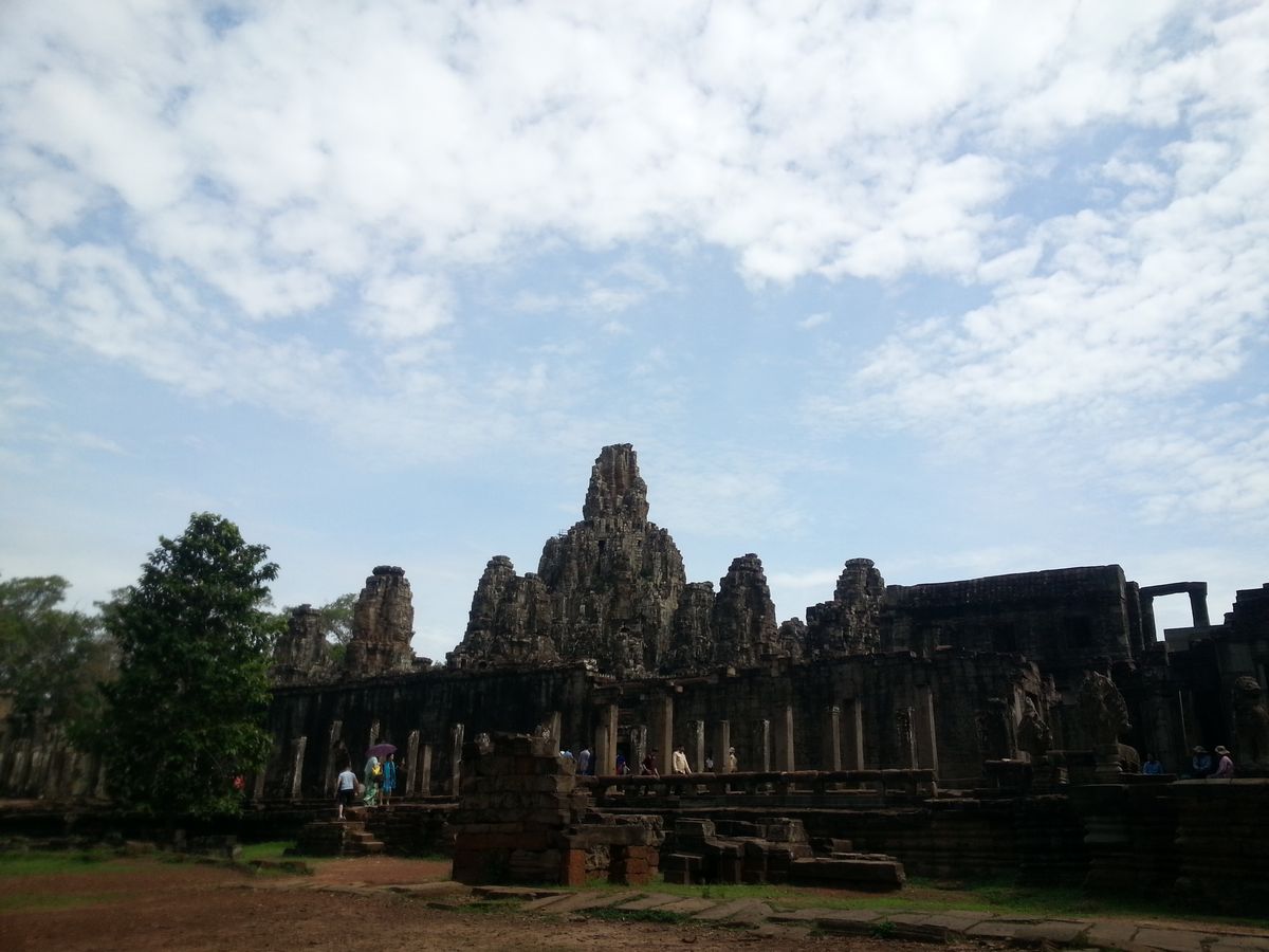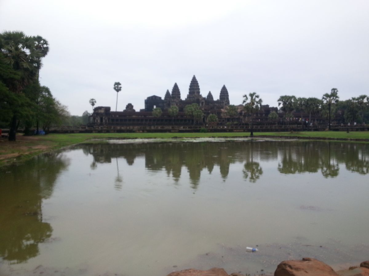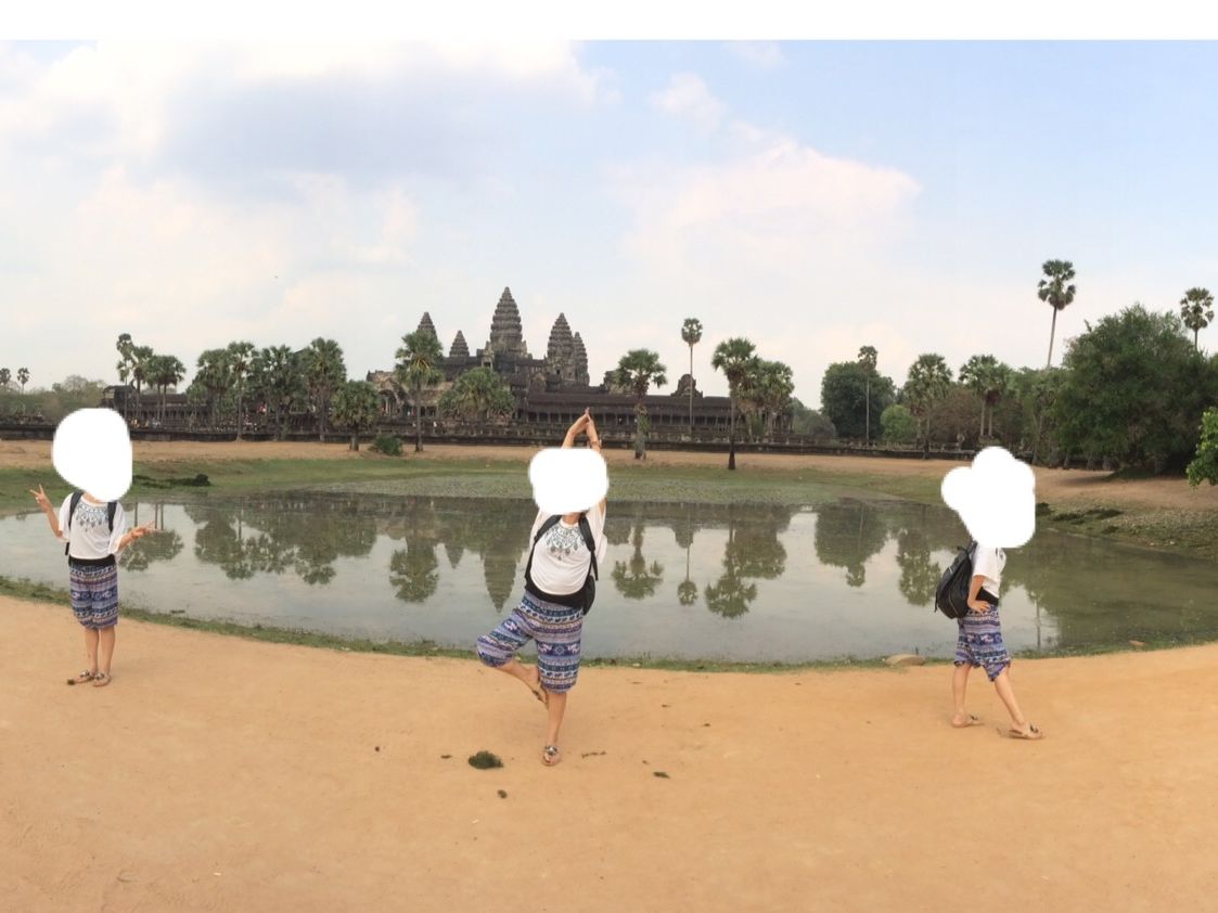 カンボジアの雨期である 5 月末にいったので、残念ながら朝日も夕日も見られませんでしたが、一日中ほぼ曇っていて、少しは過ごしやすい気候だったのかなと思います。ちなみに、朝日は、ある程度曇っていても池にはっきりと映るアンコールワットがみれます。とてもキレイでした!ガイドさんは 10 年以上のベテランで、一通り案内(説明)したら時間を決めて自由時間をもうけてくれたので、自分のペースで見て回る事ができました。説明は少し足りないとろがありましたが、質問したらきちんと答えてくれました。案内してくれているときに、私たちが写真とったり寄り道したりして遅れてしまっていても、少し先で待ってくれていて、楽に感じました。
