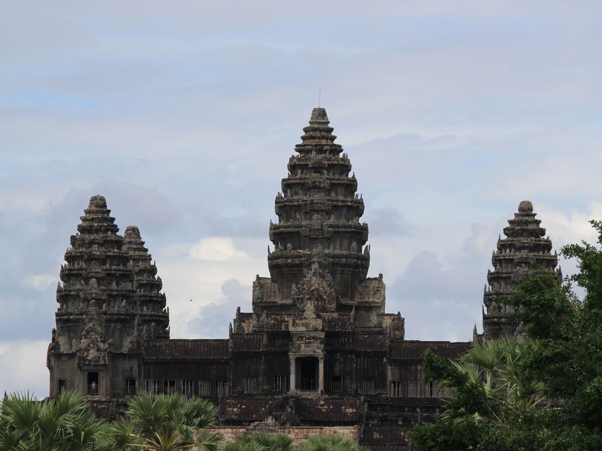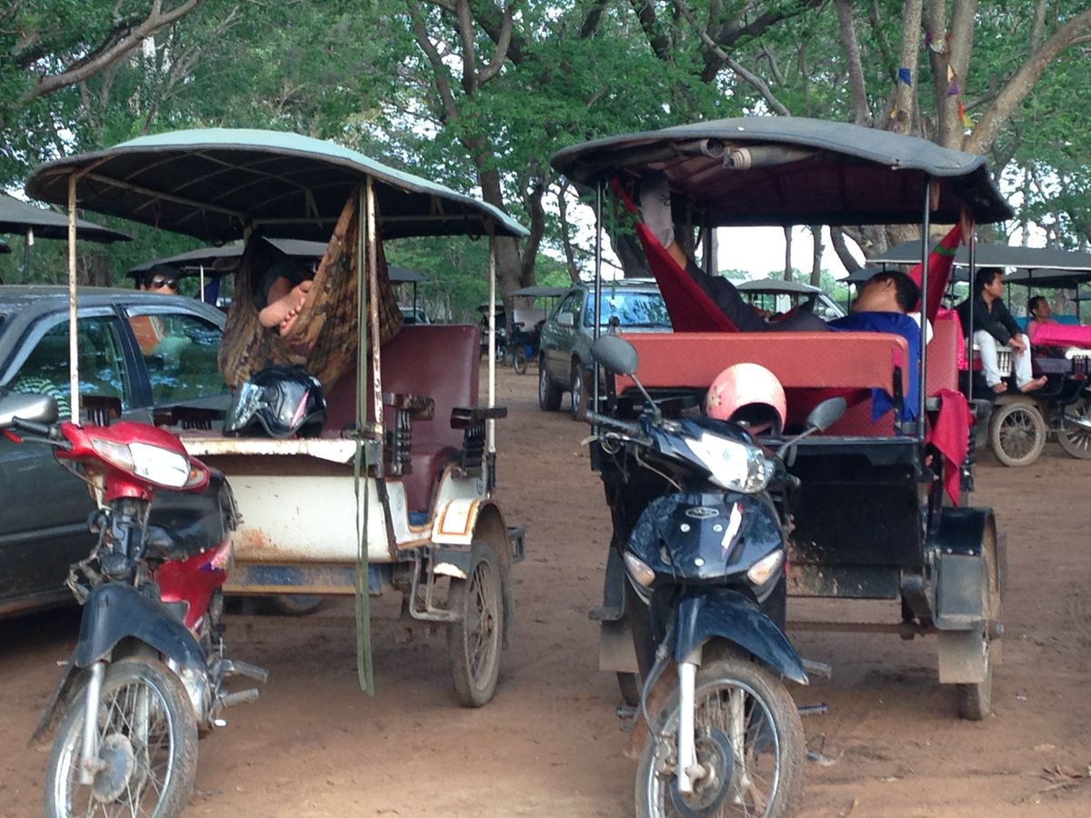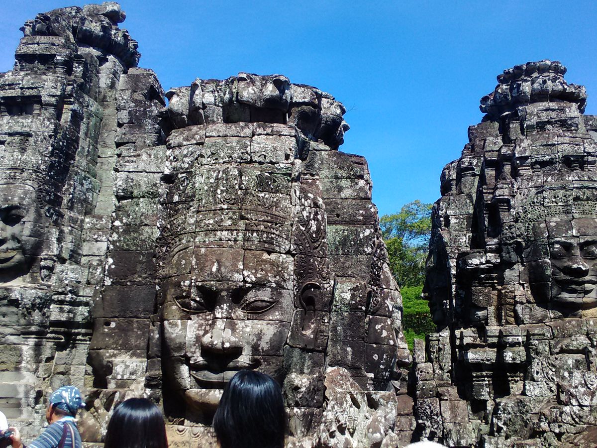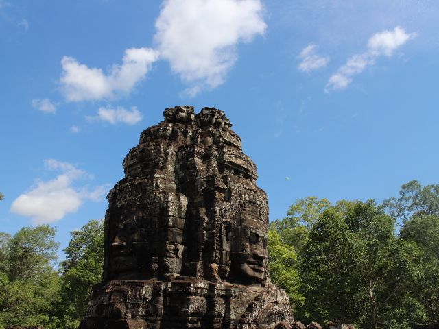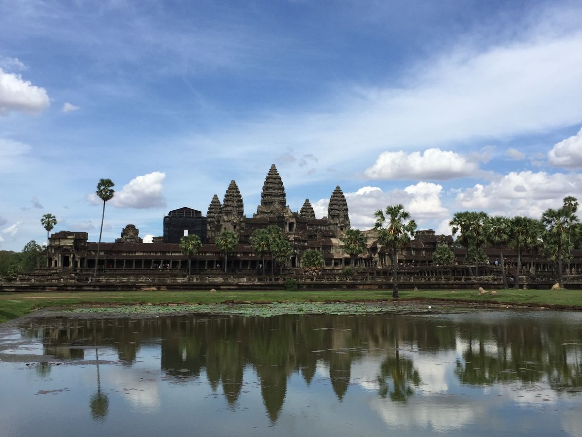 カンボジアの雨期である 5 月末にいったので、残念ながら朝日も夕日も見られませんでしたが、一日中ほぼ曇っていて、少しは過ごしやすい気候だったのかなと思います。ちなみに、朝日は、ある程度曇っていても池にはっきりと映るアンコールワットがみれます。とてもキレイでした!ガイドさんは 10 年以上のベテランで、一通り案内(説明)したら時間を決めて自由時間をもうけてくれたので、自分のペースで見て回る事ができました。説明は少し足りないとろがありましたが、質問したらきちんと答えてくれました。案内してくれているときに、私たちが写真とったり寄り道したりして遅れてしまっていても、少し先で待ってくれていて、楽に感じました。