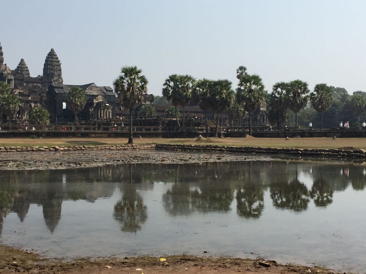 朝晩はモヤがかかり、朝日夕日を拝むことはできませんでしたが、日中は晴天で、池に映る逆さアンコールワットは非常に綺麗に映すことができました。
