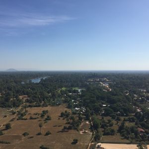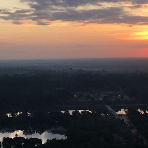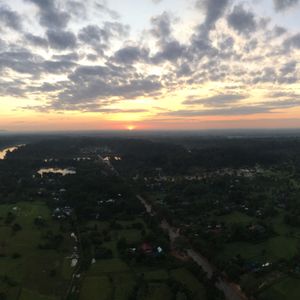 雨季の終わり、旅行中は良い天気の日ばかりでした!ホテルのロビーへ行くとすでにガイドさんが待っていてくれましたが「早いですね」と。バウチャーに記載されていた時刻より10分遅い時間が集合時間だったそうです。私一人のみ参加だったため早めに出発して下さいました。到着後、日の出までしばらく待ちます。その日は個人で来られた二人組の外国人の方と私の計3人でした。バルーンを見て「大きいなぁ〜」と思っていましたが、試運転?で一度バルーンを上げているのを見て、高所恐怖症ではないのに「怖いかもっっ」と思いました(>_<)首に下げるカードをもらい、バルーンへ。ゆっくり上がってゆくバルーンの手すりにつかまり、「Scared!!」と言い合いながら上がっていきました。上空で止まり、日の出を待ちます。少し揺れて怖かったですが、景色が最高で怖さも和らぎました。ゆっくりと日が昇り、カメラを落とさないように注意しながら写真、動画たくさん撮りました!!アンコールワットは少し距離があるのでアンコールワットと朝日、と期待するよりはカンボジアの景色を楽しむという感じで参加された方が感動すると思います。朝日が上がったらゆっくりと降下。時間は短いですが、最高の体験ができました!!ありがとうございました(ノ´▽`)ノ♪