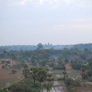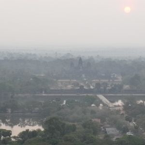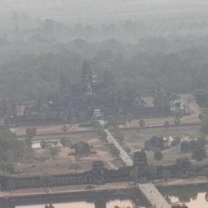 うっすらと霧がかった中のアンコールワット。地上にいるだけではわからないシェムリアップの大自然がとても美しく、気持ちのよい朝のスタートとなりました。