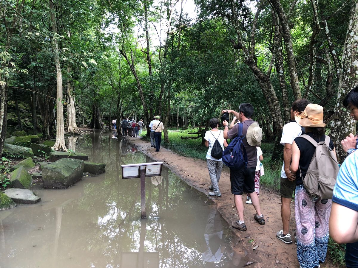ところで、ツアーの内容はジャングルの中で苔に覆われた倒壊した石の遺跡の中の木道ルートを歩くものであり、まだ修復がほとんど行われていなかった。これこそが「ザ遺跡」といえるのではないかと思えるものであり、遺跡好きにはお勧めである。また、観光後には冷たい水のペットボトルとちょっとしたカンボジア土産もいただき、参加者への心配りが感じられた。