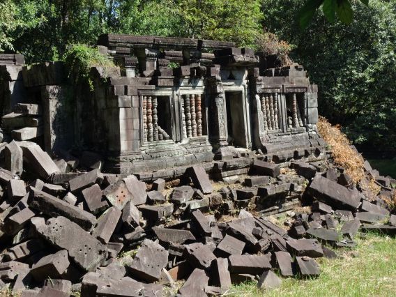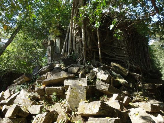 私達シニアのカップルの他は皆感じの良い日本の若者たち8人との楽しい旅となりました。また、ガイドのポーさんの素晴らしいカメラワークとお話でさらに盛り上がりました。ベンメリアはたまたまなのかわずかな観光客しかいなかったので、ゆったりとした静寂の中で倒壊したままのレリーフが余計に往時を偲ばせてくれるようでした。雨季は過ぎていたので苔生した美しさは見られませんでしたが、密林に囲まれているせいか、マイナスイオンをたっぷり感じられたり、木漏れ日に陰陽を作る遺跡は充分満足できました。帰路に高床式の民家訪問があり、外側だけの拝見でしたが、民間人の生活もプチ体験できて良かったです。