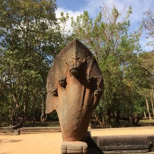 昨日のアンコールワットと同じガイドさんで安心して参加できました。午前中は他の団体が多いですよというガイドさんの話のとおりで、廻廊までは行列ができてましたが、かえってゆっくり動くことになり、いろいろじっくり観ることができました。まず最初に驚いたのは、アンコールワットでは破損していた、五つのアタマを持っているヘビの当時からの石像がそのまま残っていることでした。見学も後半になった時、ここの入り口から入りましょうというガイドさんのすすめで、他の団体がいない場所に案内してもらいました。そこは第一回廊と第二回廊との間にある、もともとは池だった場所で、そこにはわたしたちだけの貸し切り状態で、いろいろ説明してもらったり、壁沿いのところを歩いたりして、ちょっとした探検気分も味わえました。回廊の残っているのも観ることができました。