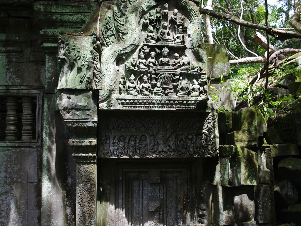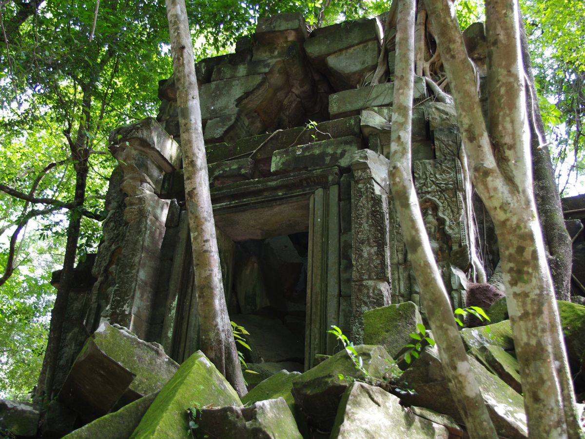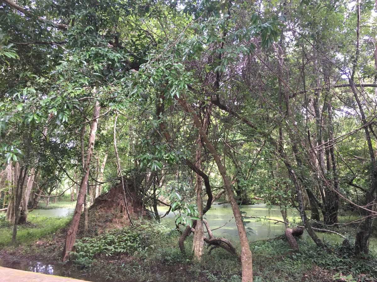 ここは雨季が最高!まず、つるでからまる木々と緑の池、のんびりと昼寝をしている牛が出迎えてくれました。しっとりとした苔は青々と崩れた遺跡を包んでいます。