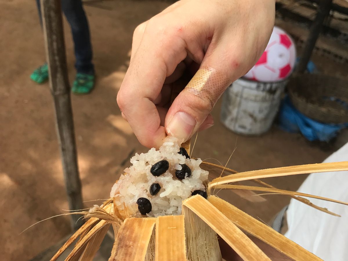 道中では、竹の筒でもち米を炊いたお土産やさんが連なっていたり、現地の人の家や様々な店が立ち並び、生活の様子を垣間見ることができました。半日の観光なので、昼はオールドマーケットで降ろしてもらい、午後からはゆっくりと買い物を楽しむことができました。