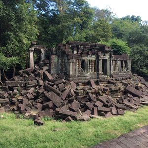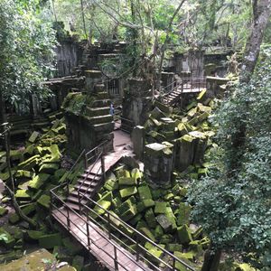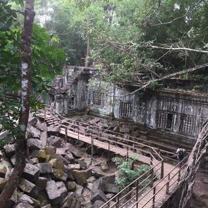 ベンメリア遺跡ですが、ツアーじたいは午前中だったためか、遺跡では人もまばらで、想像していたよりもゆっくりと遺跡を観てまわることができました。アンコールワットと同じ王様が建てたと、ガイドの方が説明してくれました。昔は崩れた石や遺跡の上を自由に歩いて回れたらしいですが、危ないので今は橋や階段が設置され、整備されたたとのことでした。遺跡はシェムリアップから車で1時間ほどでしたが、時間をかけてきた甲斐があった場所だと思います。