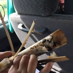 その後の帰り道では、リクエスト通り竹筒ご飯の屋台によってもらいました。1本1ドルでしたが、竹の皮を剥くてご飯をつまむと一口サイズとなり食べやすかったです。味もGOODでした。