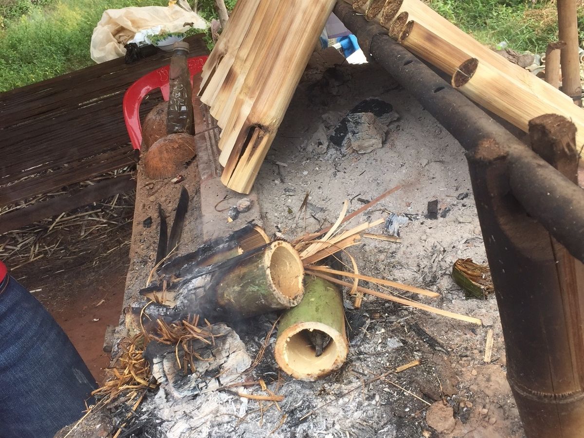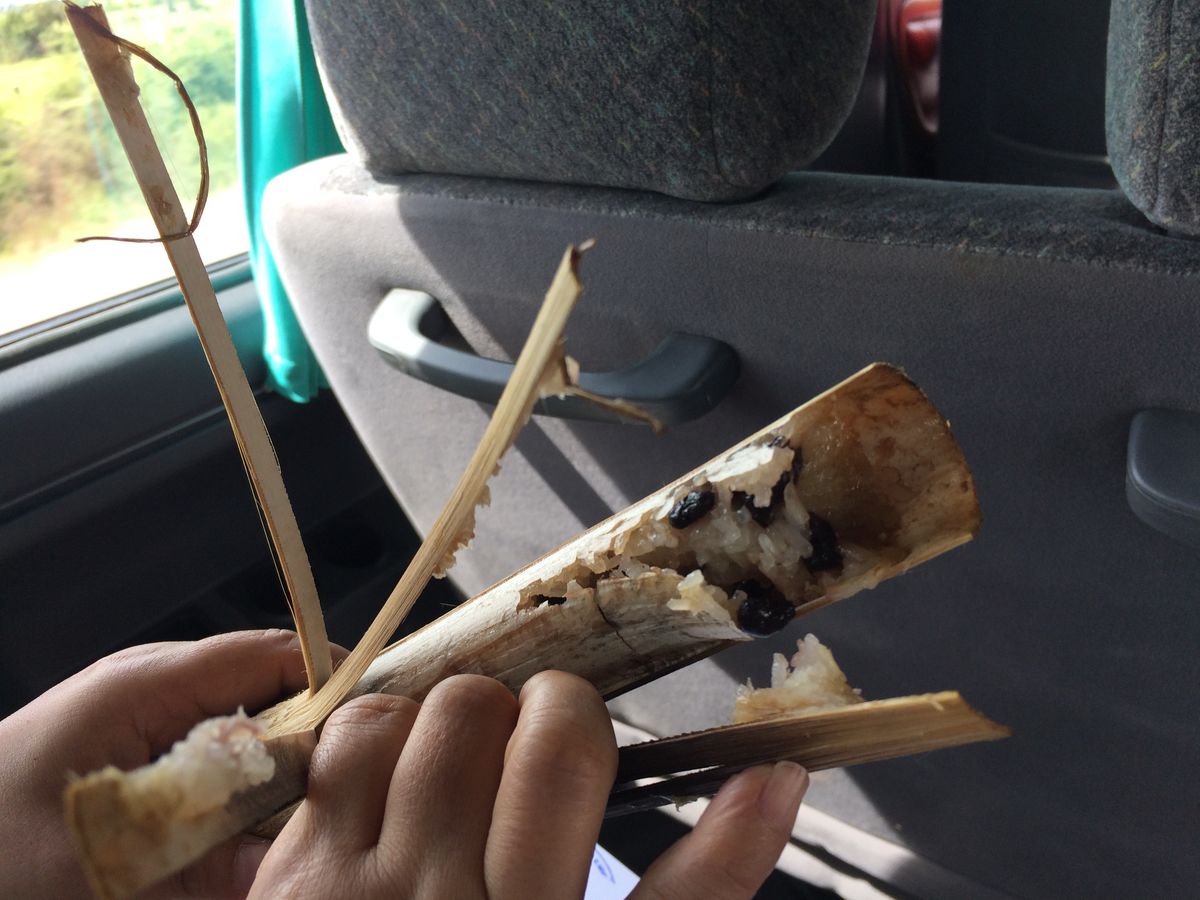 ここに来る道中で屋台があったので、何かなと思いガイドさんに聞いたところ、竹筒にもち米のご飯(おこわのような)が詰めてある軽食とのこと。帰りに寄ってもいいですかとお願いしたところ快諾していただけました。