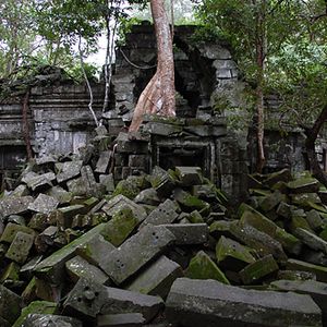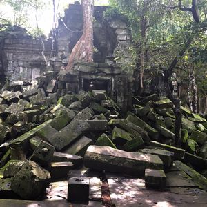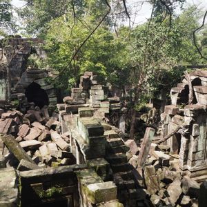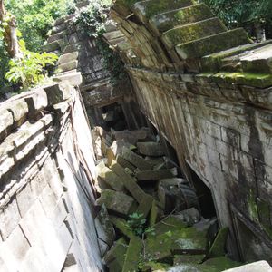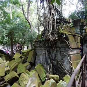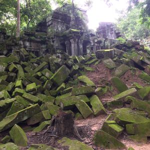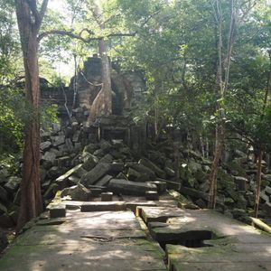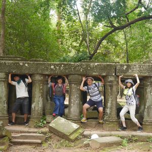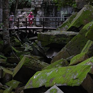 アンコールワットやアンコールトムとは雰囲気が違い、自然の中に遺跡が修復されないまま残っているといった様子でした。それがまた、いい雰囲気でした。今はある程度は整備されてしまったそうですが、10年前はもっとつるがすごかったようです。今でも十分すごいつるでした。歩いて見学するだけのコースもあるようですが、崩れた岩に上り奥深くの遺跡も見ることができました。遺跡に入り込んだことで、より雰囲気を感じることができました。