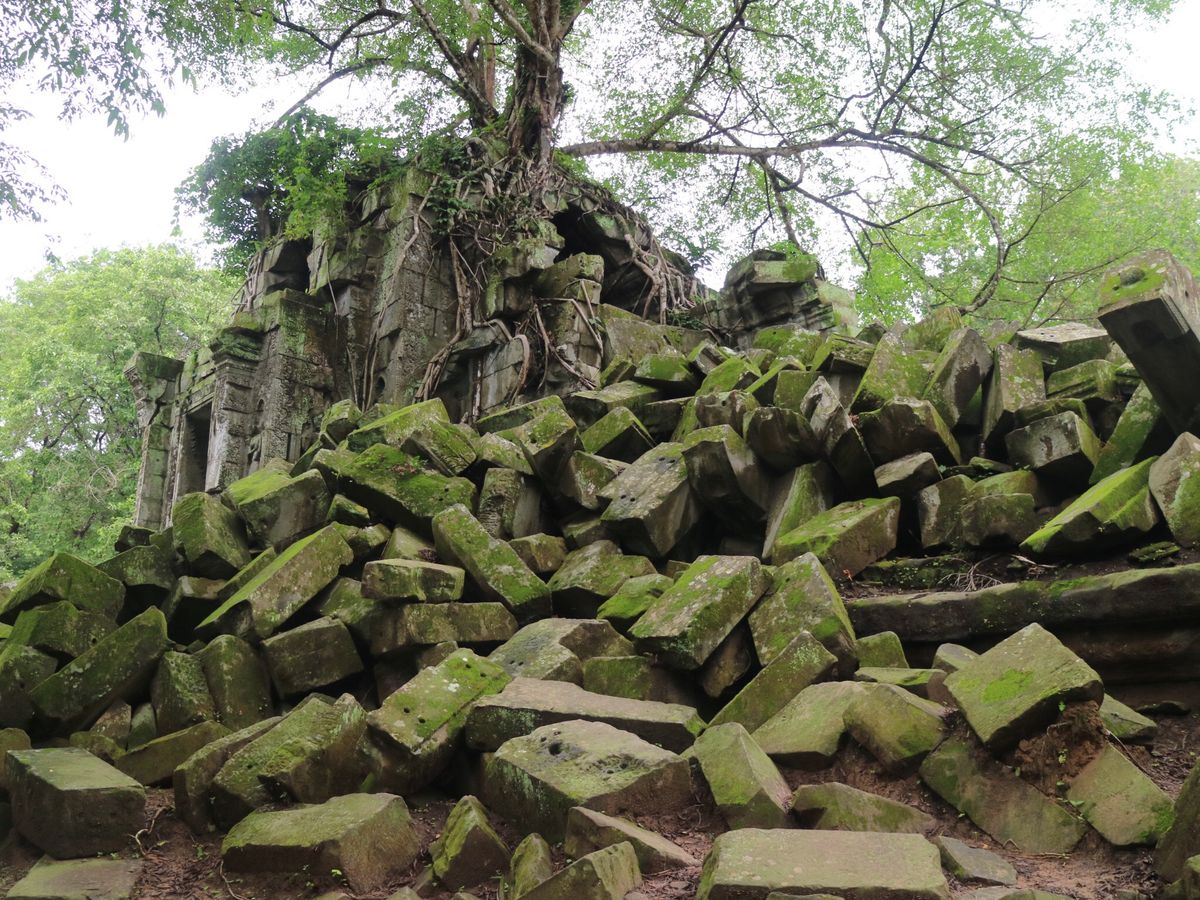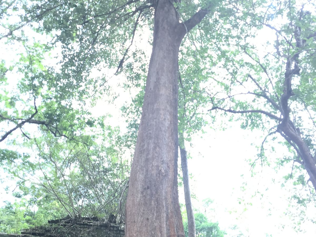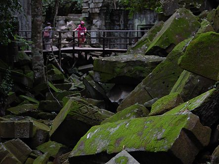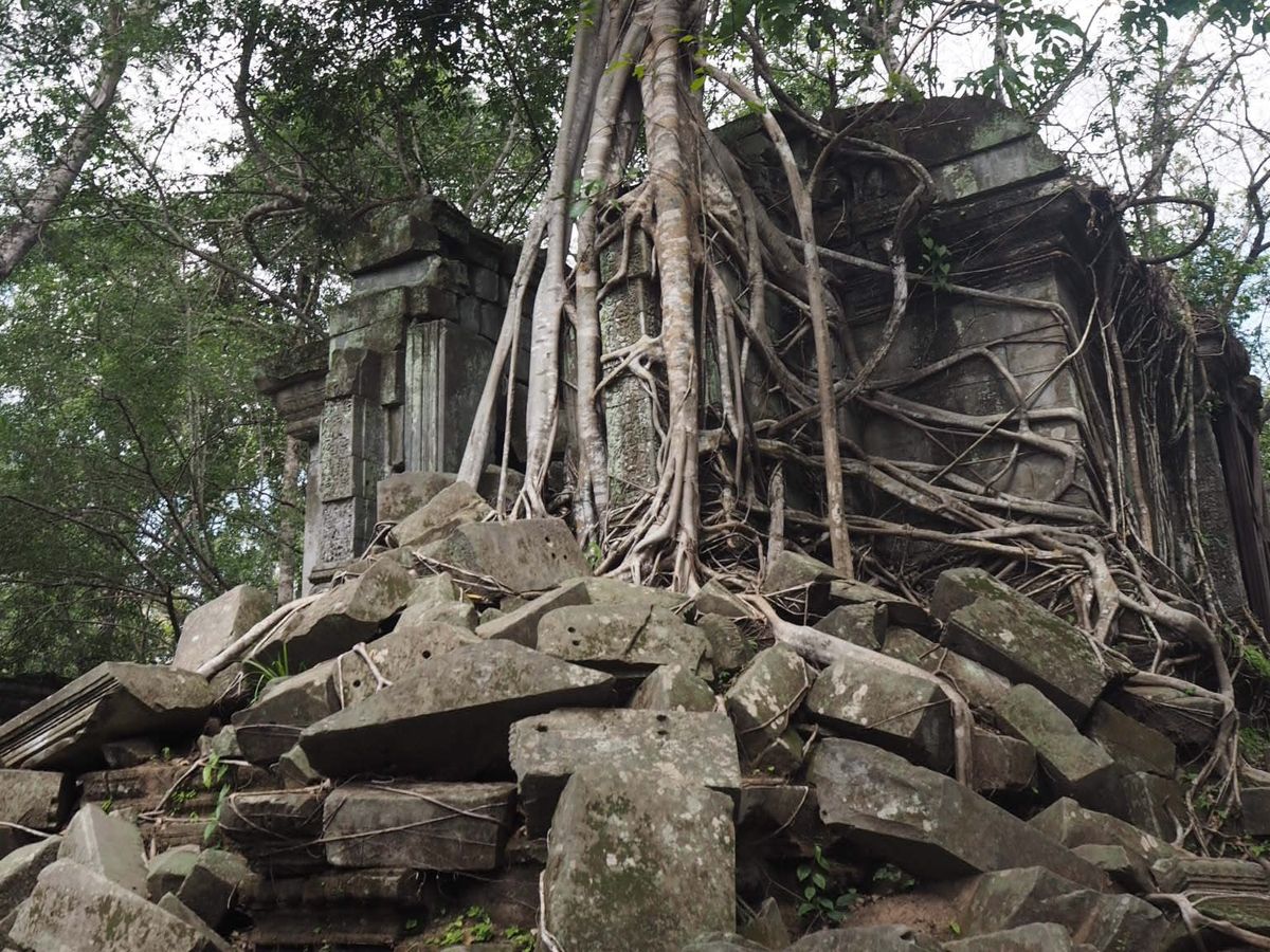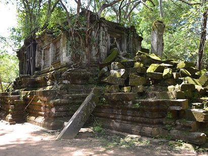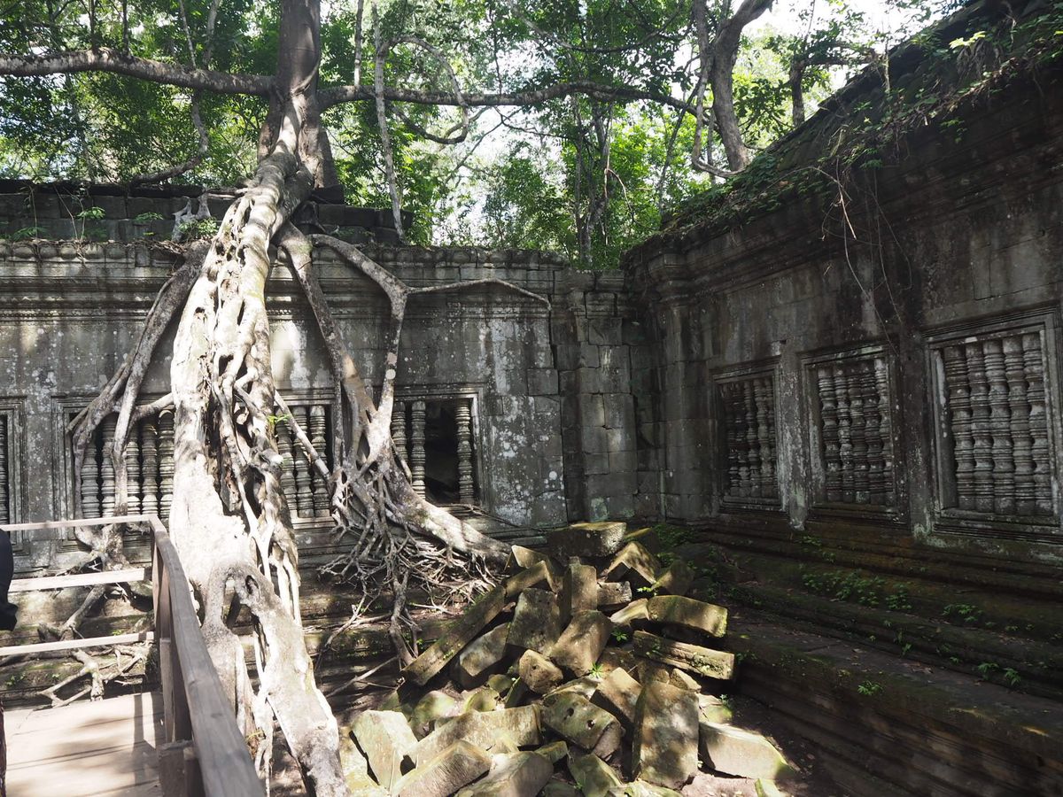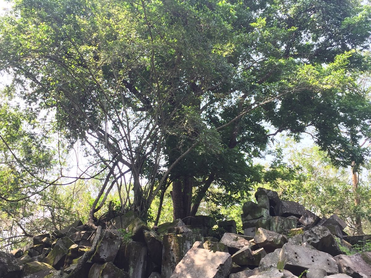 バスから数分歩くといよいよ遺跡が見えてきました。未修復の遺跡だけあって、石が無造作に積みあがっている中に遺跡が埋もれているような雰囲気。そしてタプロム以上に木々の侵食が進んでいる姿は圧巻です。
