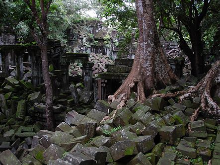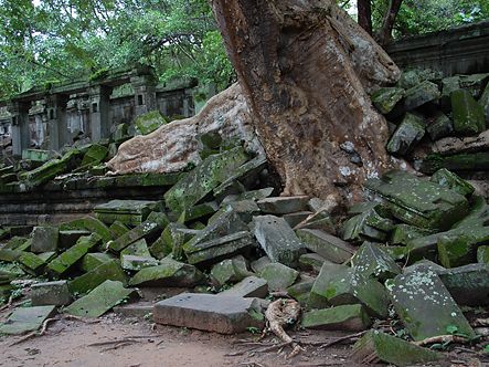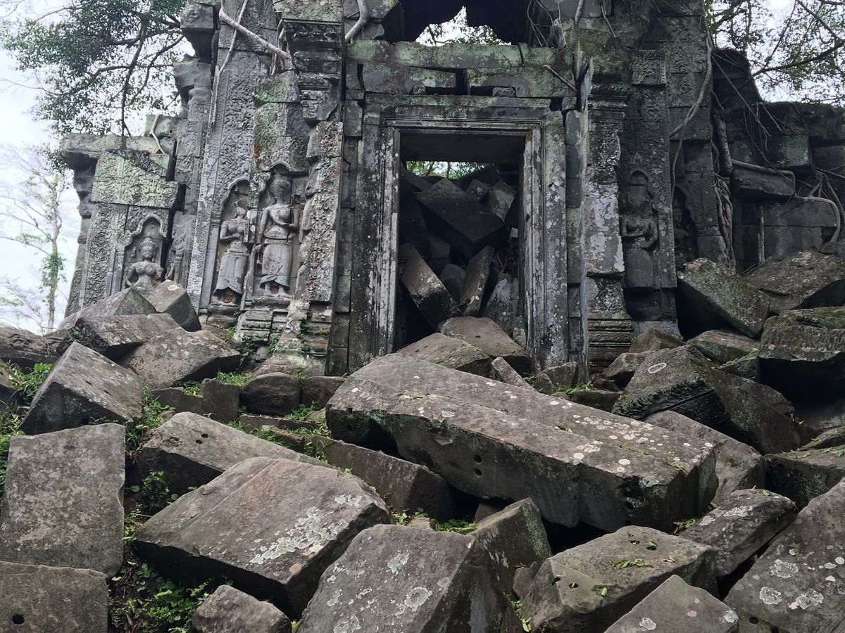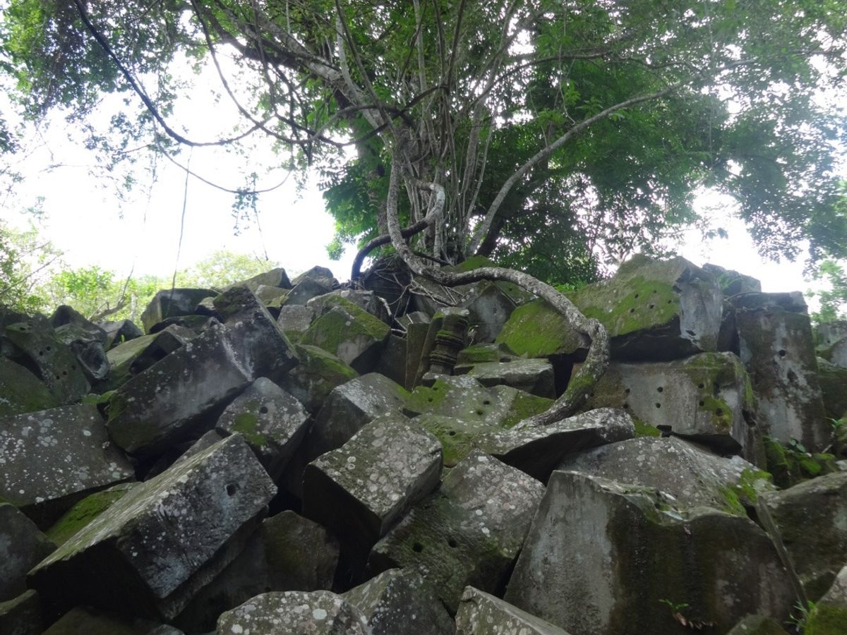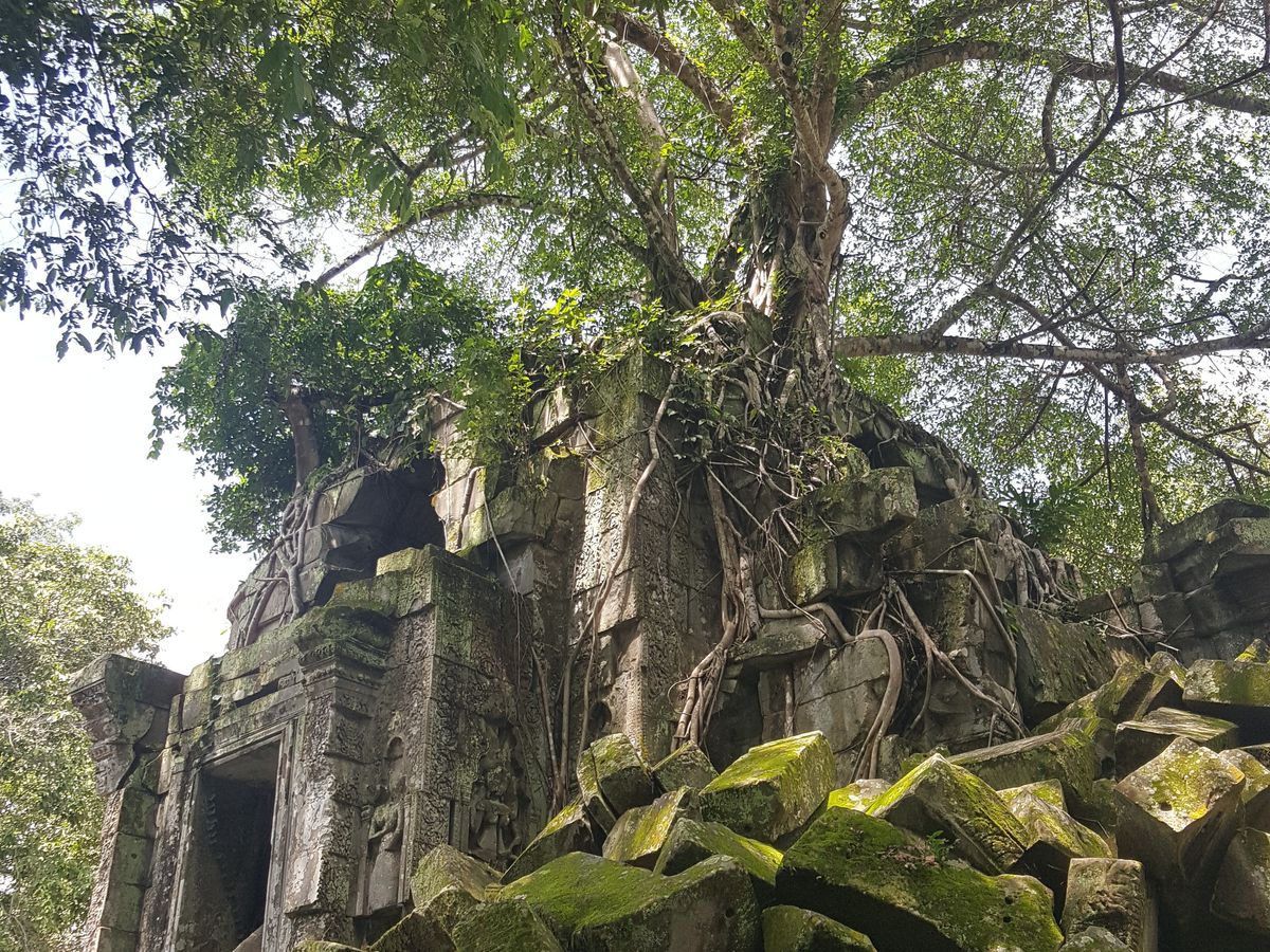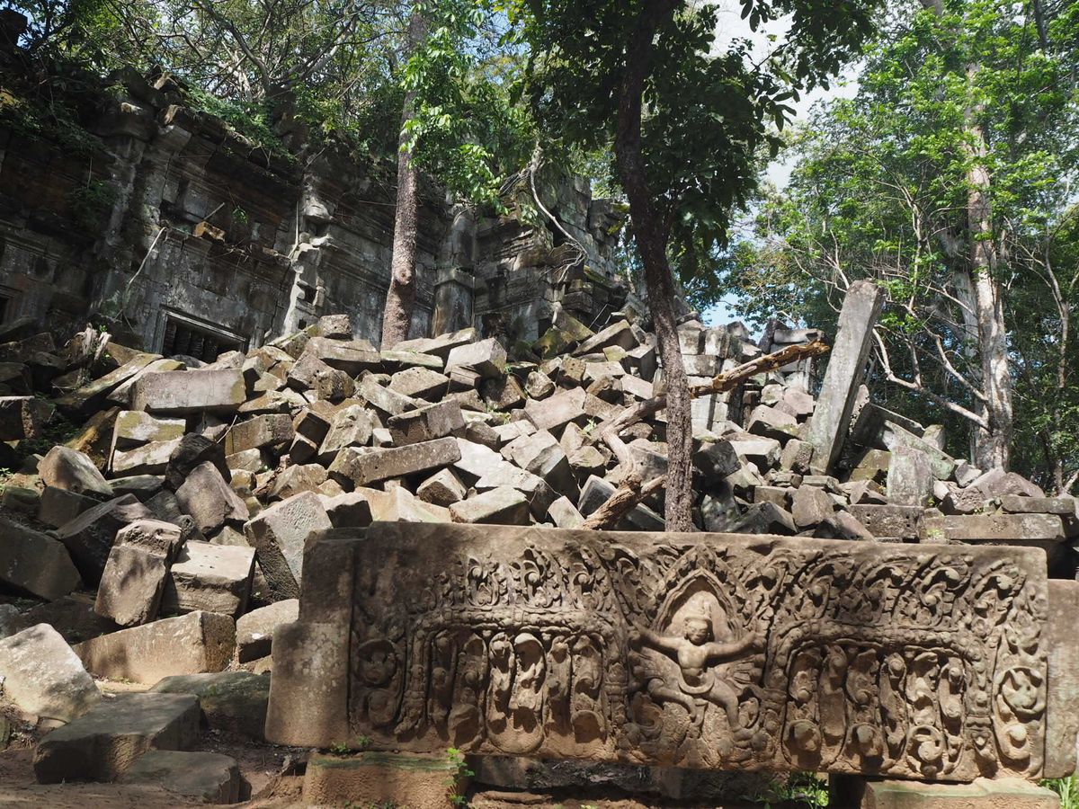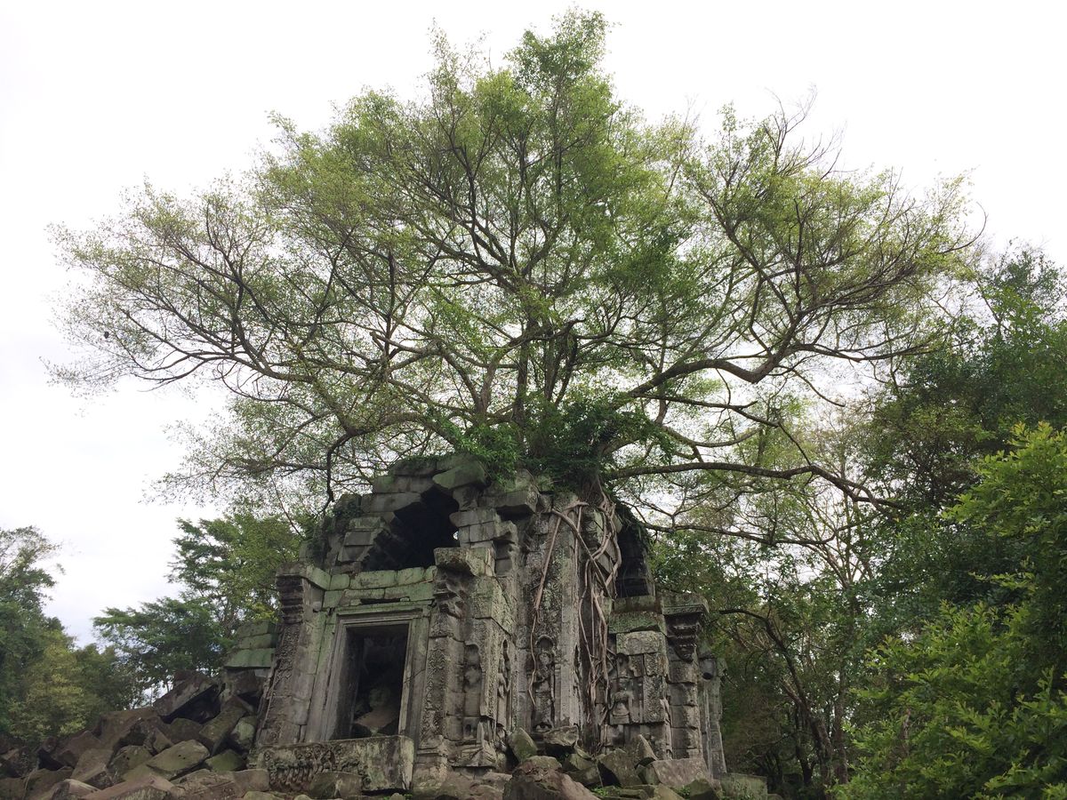バスから数分歩くといよいよ遺跡が見えてきました。未修復の遺跡だけあって、石が無造作に積みあがっている中に遺跡が埋もれているような雰囲気。そしてタプロム以上に木々の侵食が進んでいる姿は圧巻です。