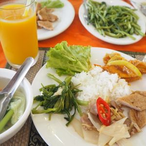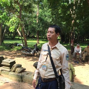 ガイドさんも丁寧に説明してくださいました。中国や韓国の団体ツアーの方々が多く道も狭いのですが、説明する場所や写真を撮るタイミングに工夫をして重ならないように配慮してくださいました。裏道などにも入って木の枝に乗って写真を撮ったりと比較的自由に楽しませてくれます。その分、動きやすい服装や歩きやすく滑りにくい運動靴を履いて参加する方が良いと思います。水は500mlのペットボトルを配ってくれますが、とても暑く動くので、必要なら持参した方が良いです。クロマーのプレゼントもありましたし、地図を頂きツアー参加後の自由散策にも役立ちました。道中、片道一時間くらいかかりますが、道端で竹に入った赤飯を一本0.5ドルで売っていました。それが食べて見たいと話すと車を止めて買わせてくれました。餅米に豆を入れてココナッツミルクで蒸しているそうです。カンボジア人は移動の時に食べるそうです。とても美味しかったですし、その後オールドマーケットなどで探しても売っていなかったです。