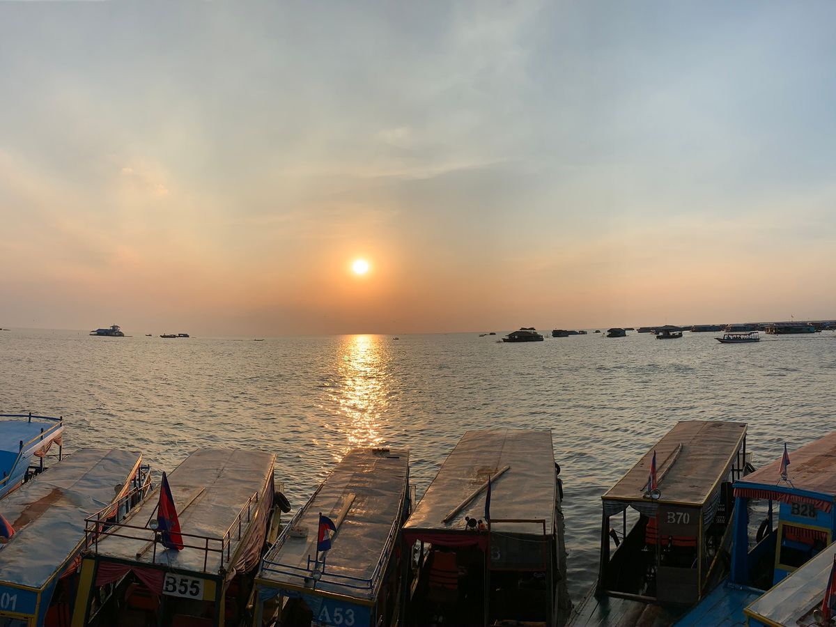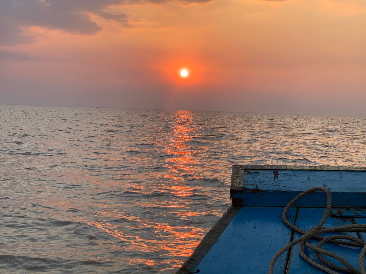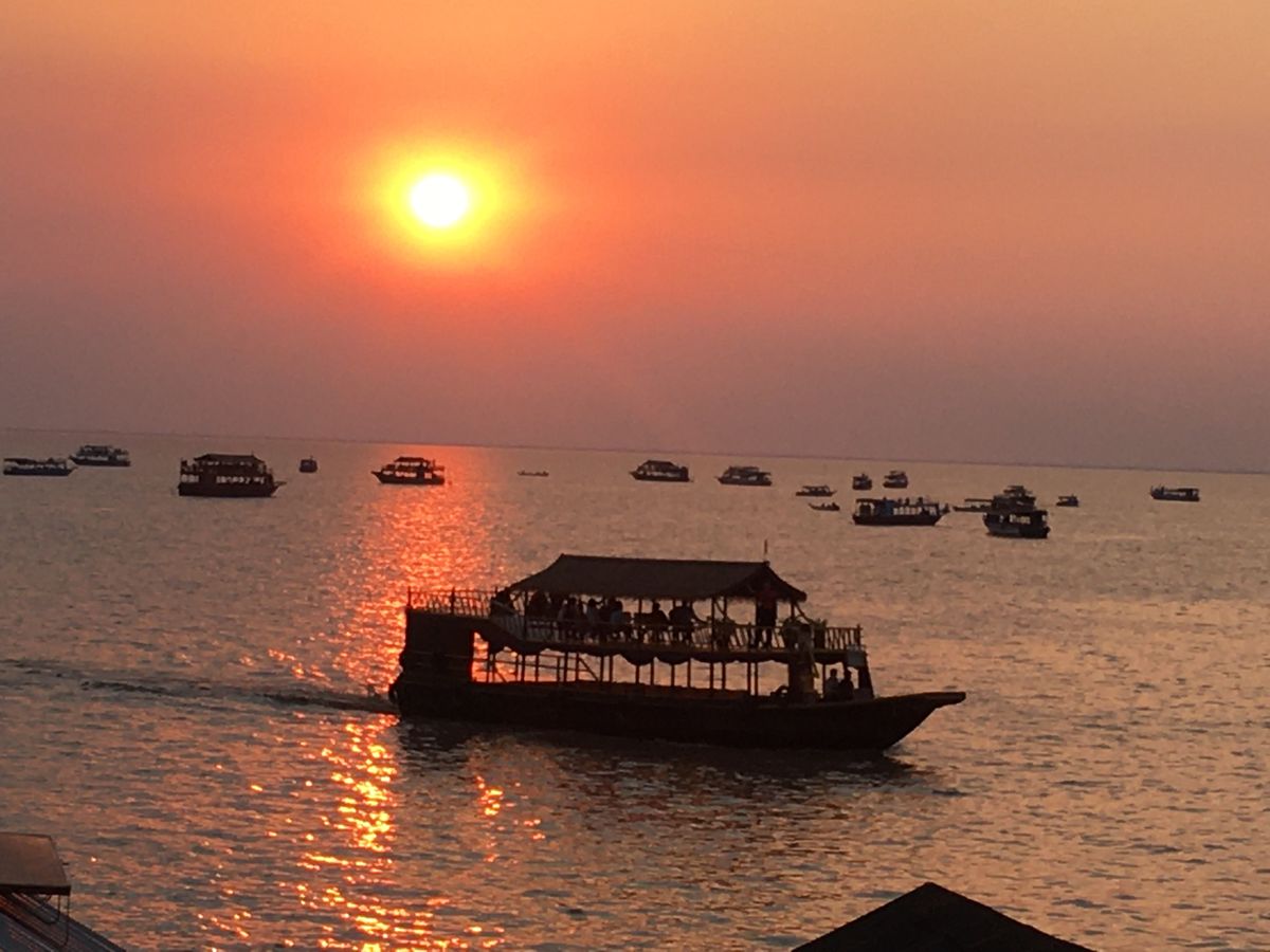 周りに観光客が沢山いてあまりにもゴミゴミしていたのでガイドさんが気を利かせて下さり貸切ボートで静かな沖まで出ました。そこでエンジンを切ってプカプカと静かにカンボジアの美しい夕陽を眺める事が出来ました。