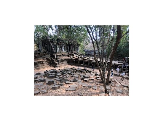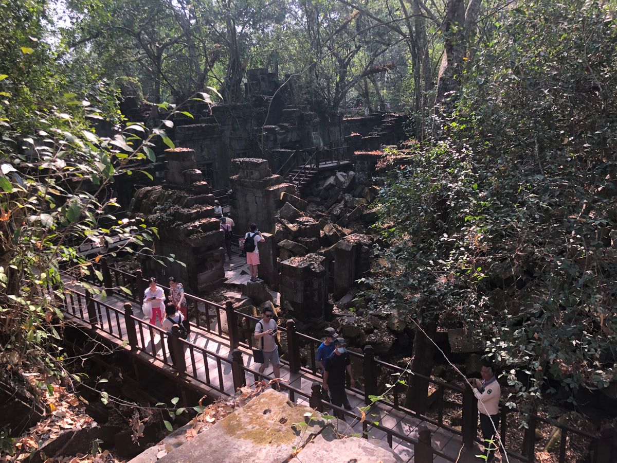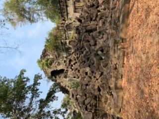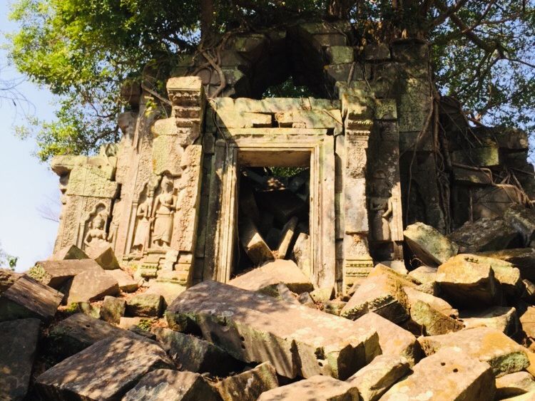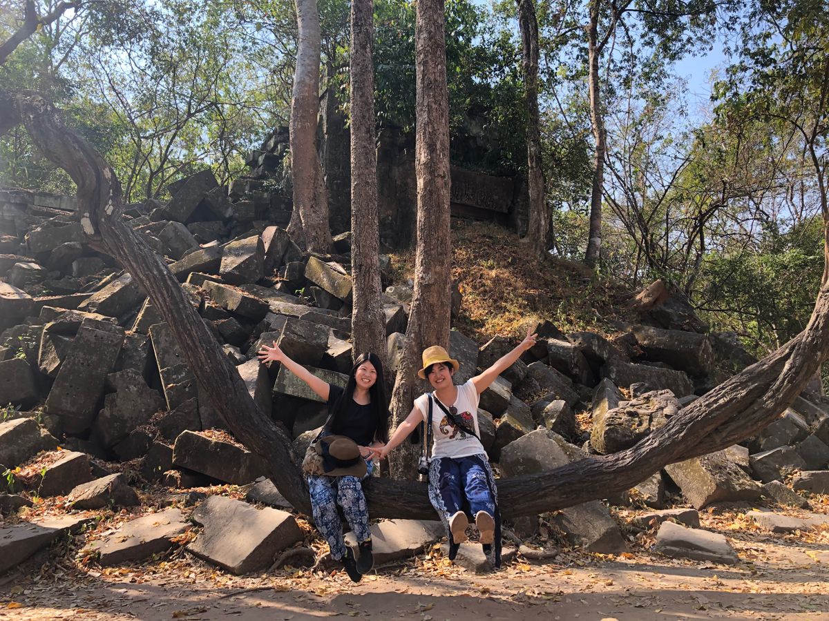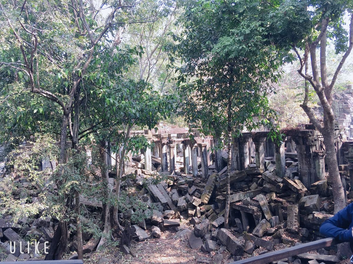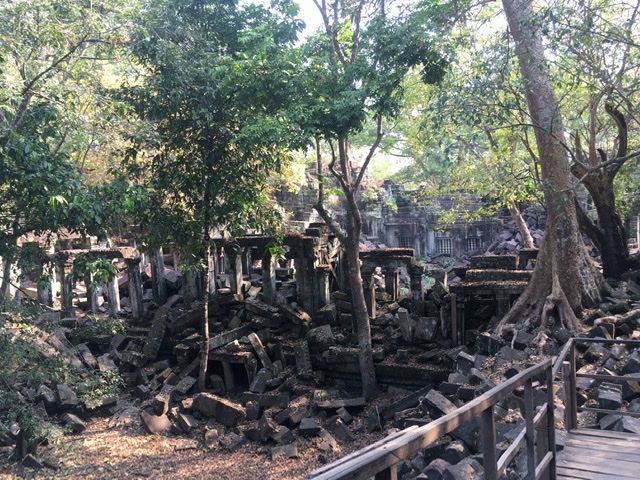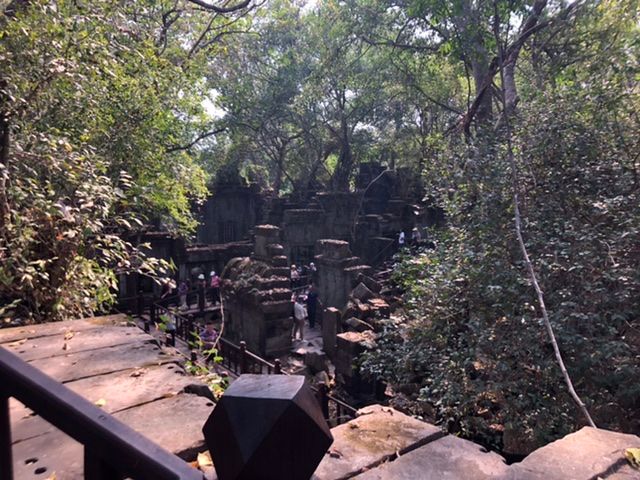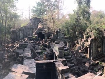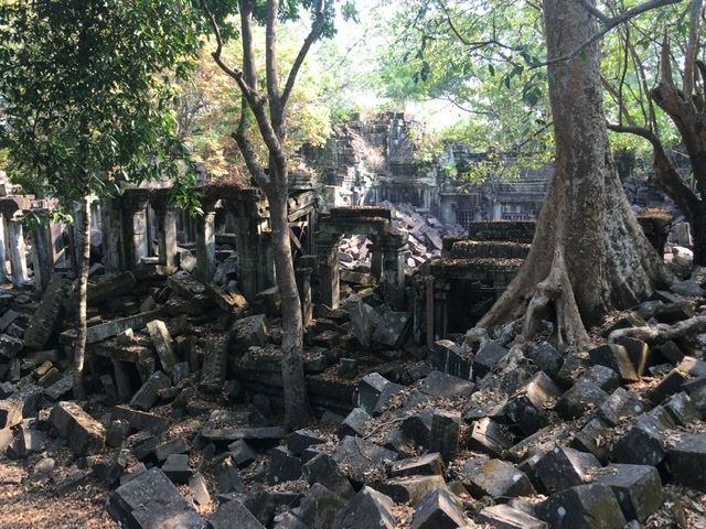 ベンメリアは森の中にある寺院で木を伐採されたり、遺跡の盗掘、自然破壊で今のような姿になっているとのことでした。森林の中にあり、影があるので思ったより涼しく、アンコールワットより快適に観光できました。乾季なので苔むした感じはありませんでしたが、遺跡が崩れているのが大変絵になる素晴らしい場所でした。アップダウンがあり、冒険してるような体験ができました。2年後には世界遺産に登録されるそうです。