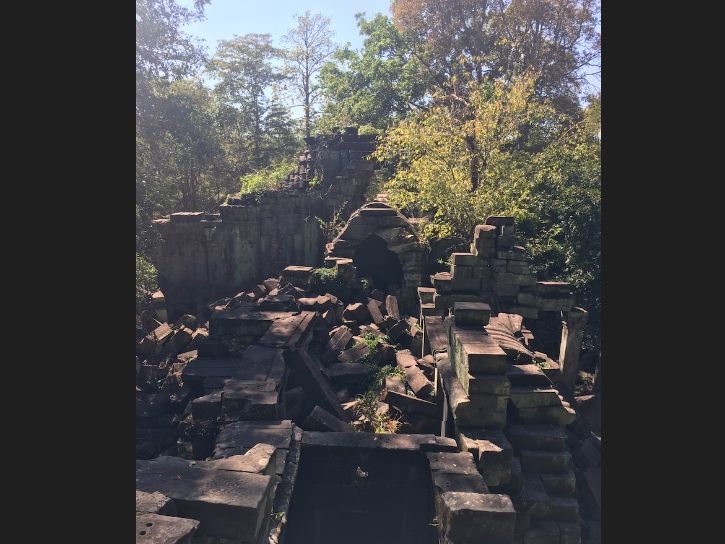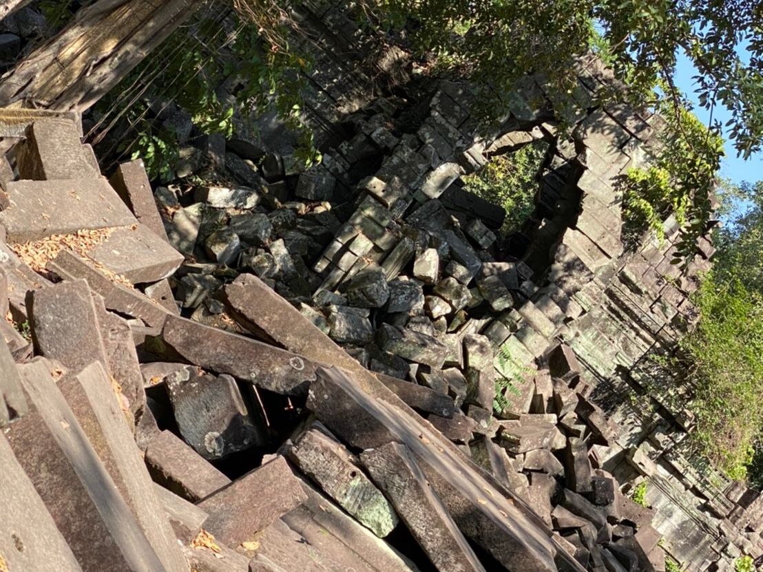遺跡はたくさん残っていて、自然に崩れただけの状態なはずなのに、とても美しかったです。雨季だとコケがたくさん生えて、もっと緑が強くなるそうなので、さらにラピュタの世界に近づくのではないかと思いました。