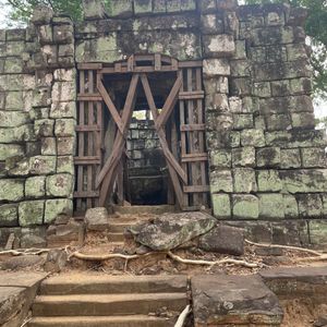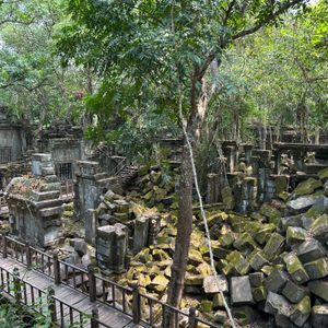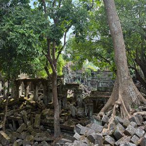 ベンメリアは密林の遺跡というだけあり、遺跡が木の根に飲み込まれた様子がとても印象的でした。雨季が終わる頃に訪れましたが、崩れた石材を一面の苔が覆う幻想的な緑の景色に感動しました。宮崎駿の世界と聞いていましたがまさにその通りでした。乾季には苔が茶色に変色するためこの時期が一番綺麗でお勧めだそうです。いずれはアンコールワット同様に崩れた遺跡を修復して公開する計画があるとのことですが、発見されたままの姿も感慨深いです。ガイドさん曰く、以前は見学もアスレチックのような険しいルートだったそうですが現在は遊歩道が完備され軽装で大丈夫でした。