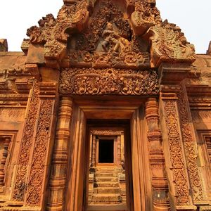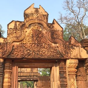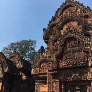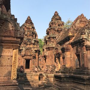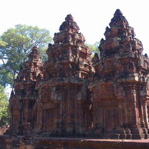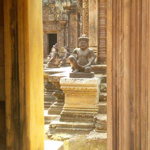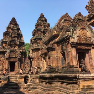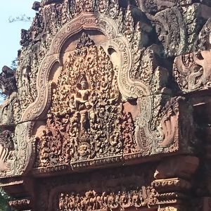 バンテアイスレイは赤い砂岩で建造されたこじんまりとした、ヒンドゥー教寺院遺跡で塔門や祠堂の全面が彫刻で飾られていて美しくて、品がある寺院と感じました。