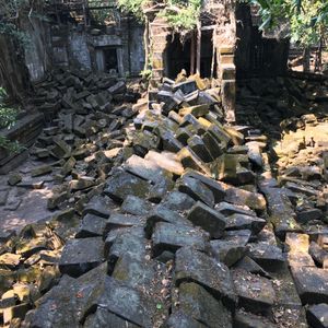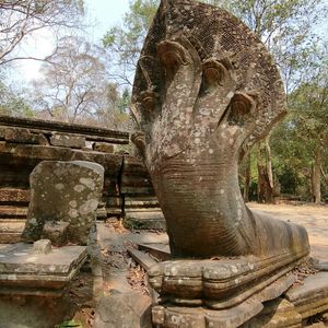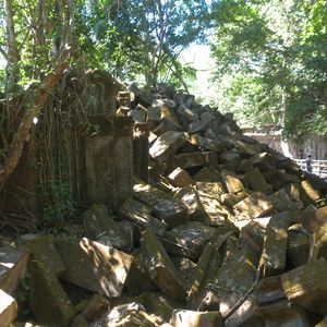 11時、次の訪問地ベンメリア寺院遺跡へ40分、ベンメリア寺院は1090-1120年ごろ建造されたヒンズー教の寺院、第一印象は壊れ方がひど過ぎる。ほとんど原形をとどめていない。地震でもなければここまで壊れないだろうと思う、ガイドさんによればカンボジアは地震がないという。過去の戦争やポル・ポトによる人為的な破壊を感じさせる。唯一ナーガと呼ばれる蛇神像はきれいに残っているのが不思議な気がしました。