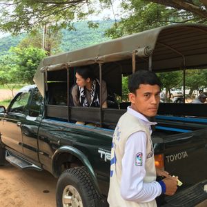 プレアヴィヒアまではシェムリアップから車に乗って片道3時間。山の麓に着いてからは更に車を乗り換えて、急勾配の山道を登っていく。